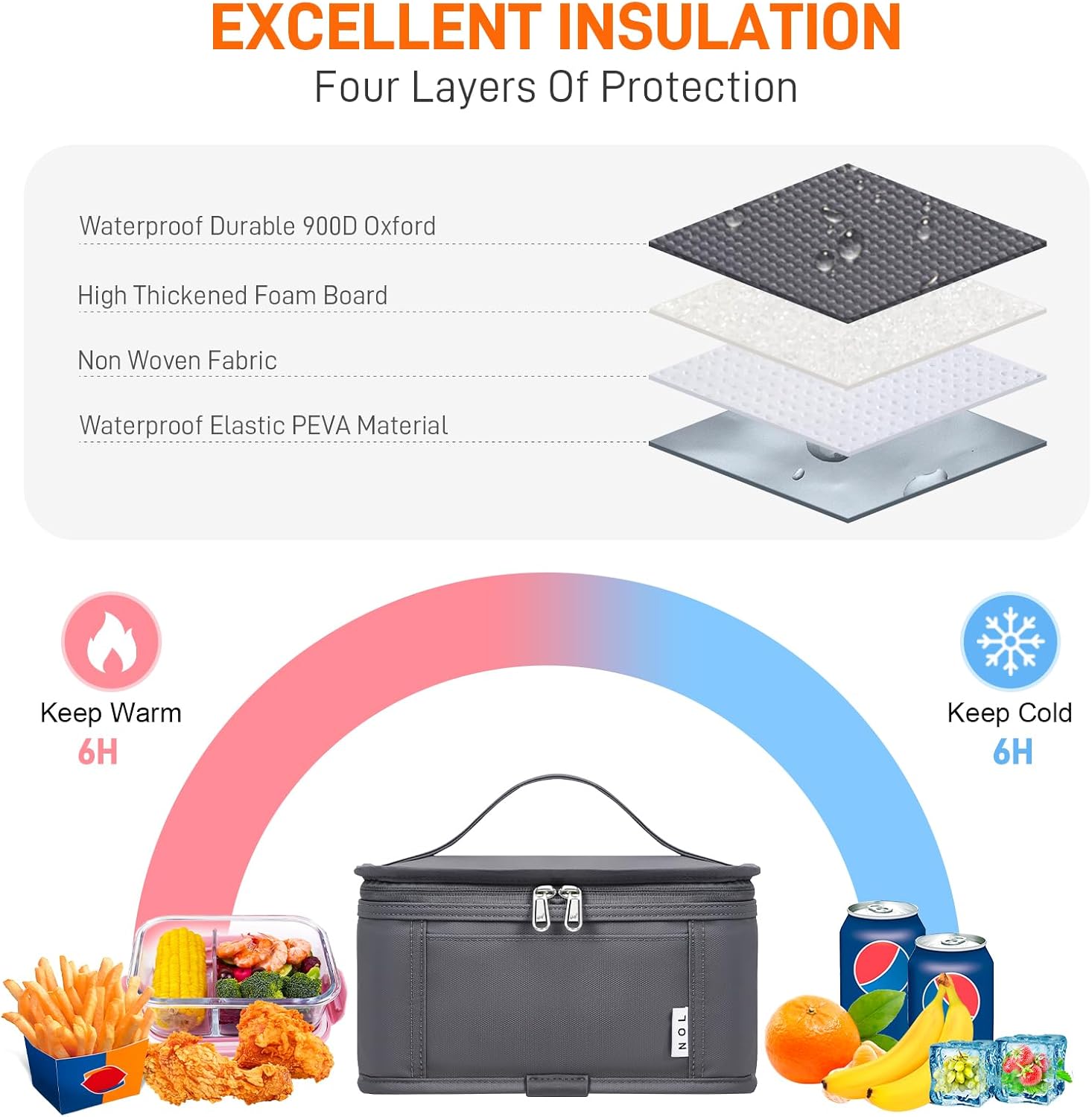 - Premium Material: NOL mini reusable lunch bag is made of the highly quailty 900D Polyester, the inner layer is PEVA material and the middle layer is specially filled with 5mm thick insulating lining, which provide great insulation to keep the food warm or fresh up to 3-4 hours.The double zippers of the thermal bag are made by NOL, very smooth and resistant.