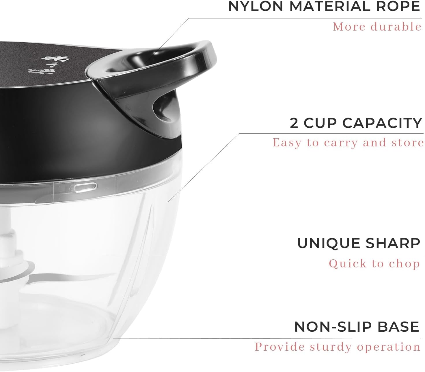 - Soft-grip Lid & Anti-skid Base - To ensure ultra-comfort, this chopper vegetable cutter has a soft-grip lid, an anti-skid base. The non-skid ring on the bottom keeps the cup from sliding around while the spinning blades chop finely or coarsely.