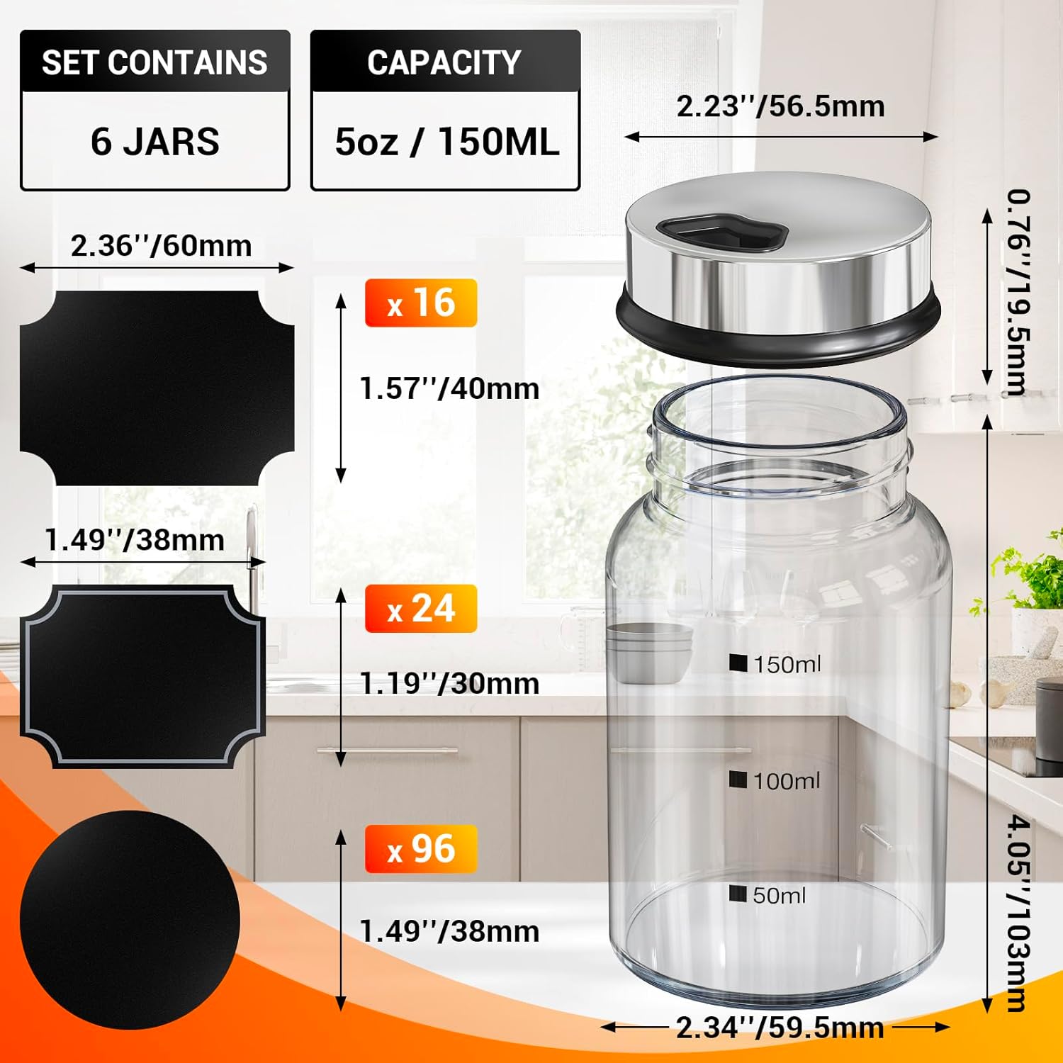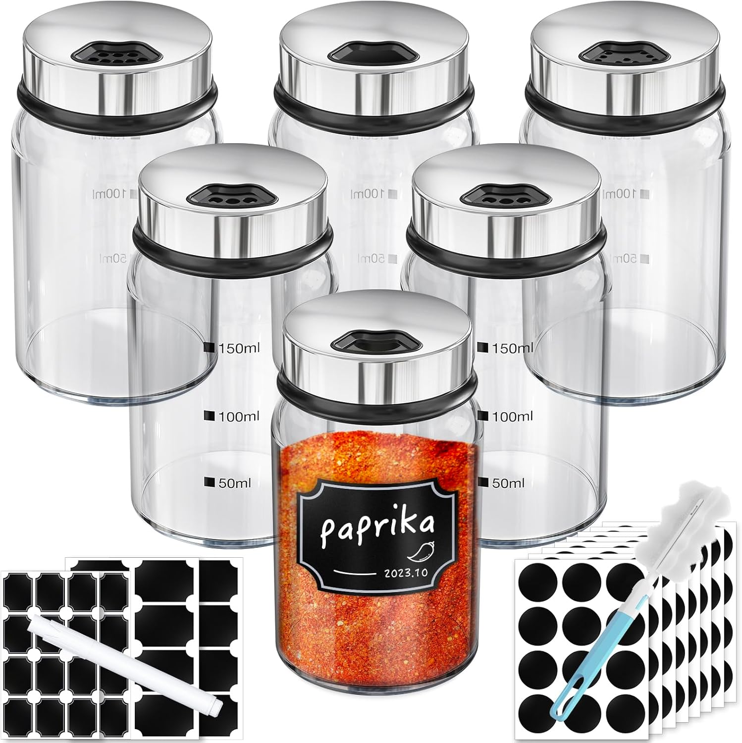 - 6PCS Glass Seasoning Jars Set: This empty spices jars with label set includes 6 pack of 5oz condiment bottles, 136 black blank labels and 1 white chalk marker pen. Each package offers a complete solution for storing and labeling spices. The clear condiment bottles, seamlessly integrate into any kitchen space,such as drawer,cabinet, as great organizer for keeping condiments. The set comes with black label paper for customization, and the marker pen makes labeling a convenient process.