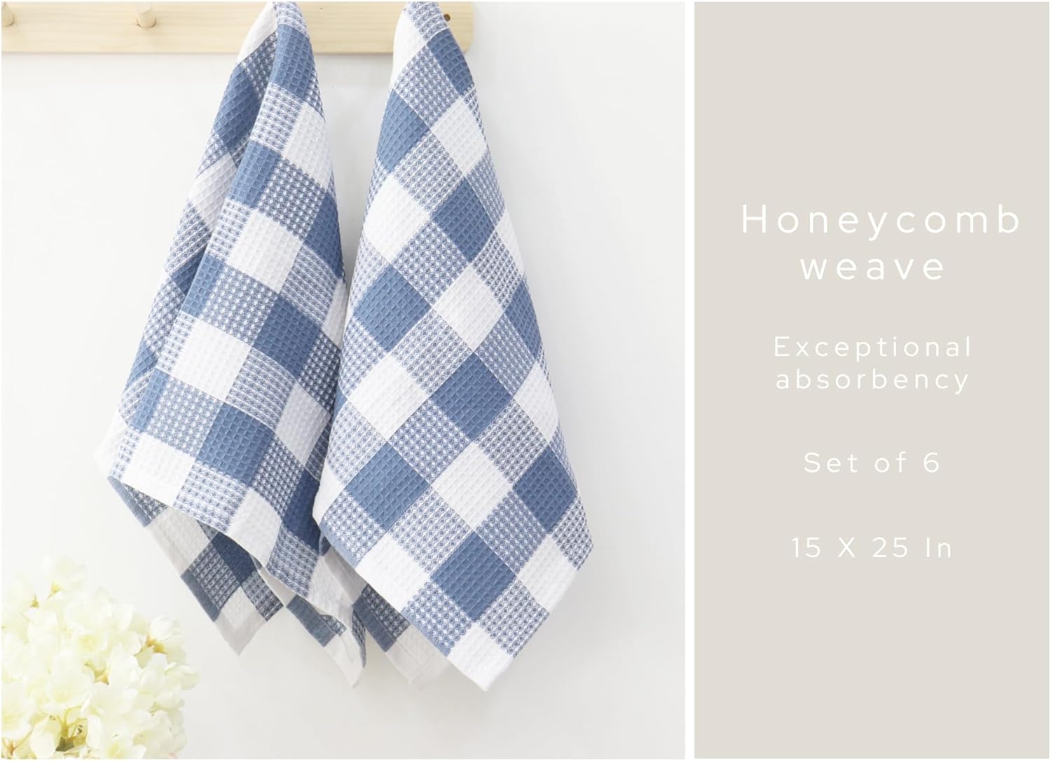 - Pack of 6 Waffle Weave Dish Towels measuring 15 by 25 Inches.