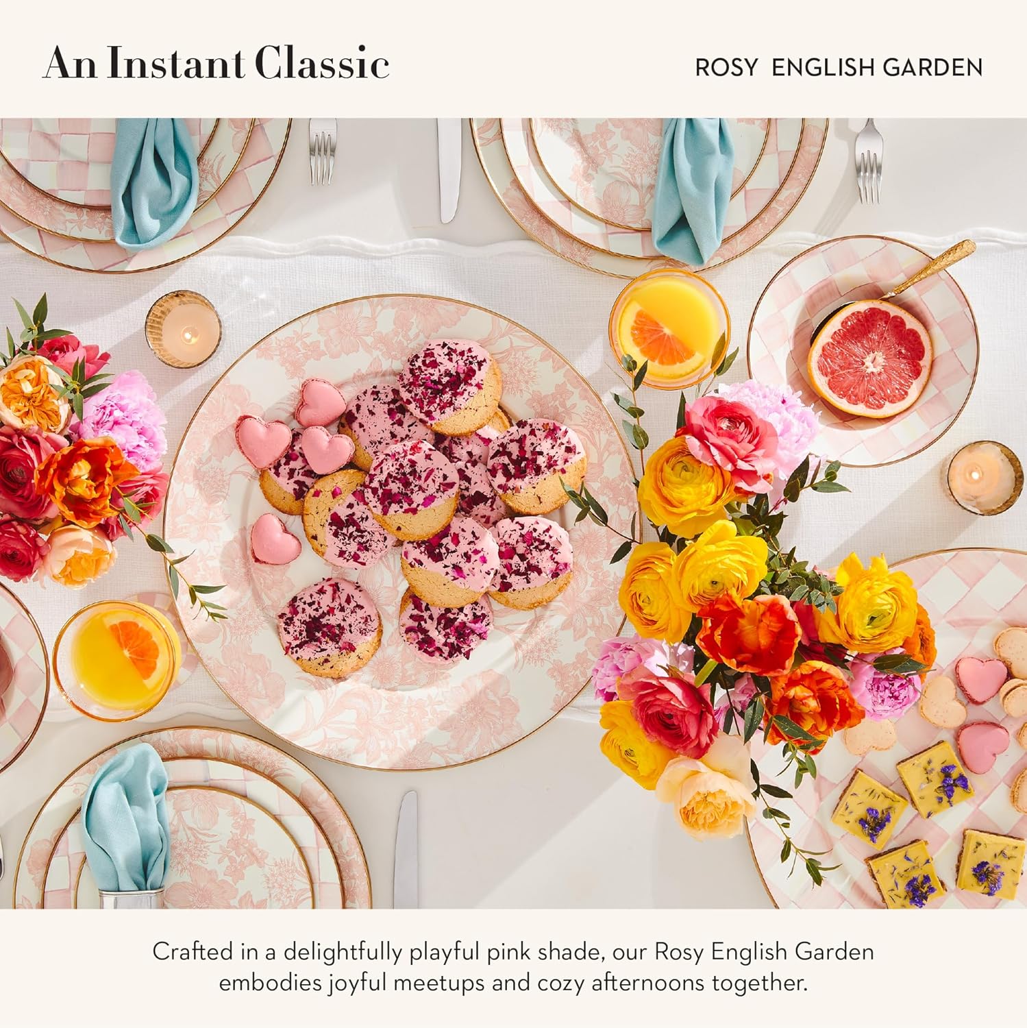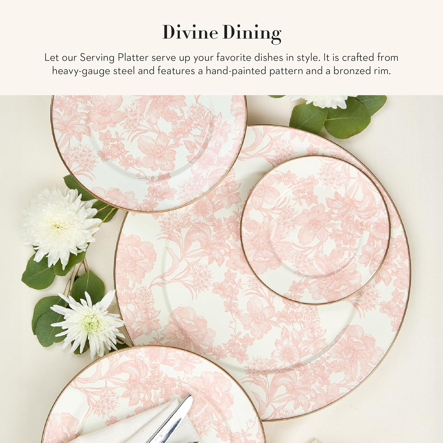 - ENTERTAINING ESSENTIAL: Serving platters for entertaining donโt get any more floral, pink, or pretty than this. Our Rosy English Garden platter is decorated with hand-applied transfers and rimmed in bronzed stainless steel. It features a hand-glazed heavy-gauge steel underbody.