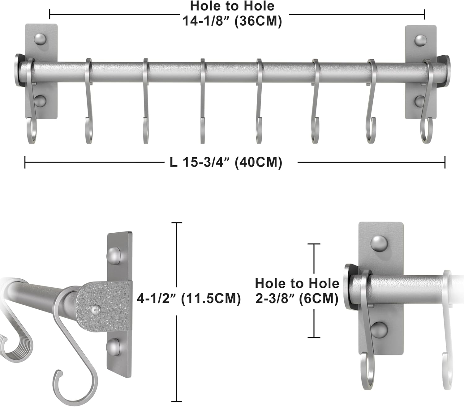 - Easy to install, sizes: 15-3/4 L x 4-1/2 H x 1-5/8 inch, including 2 x kitchen rail with 16 S hooks, mounting hardware, silver color,