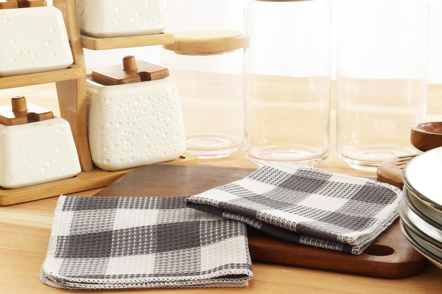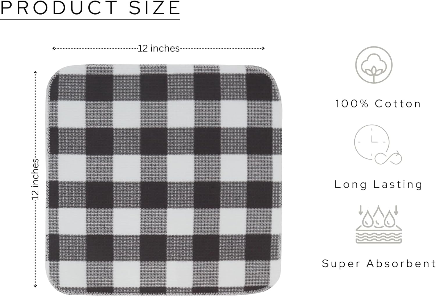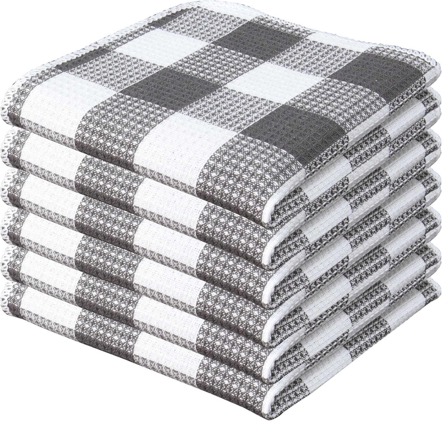 Waffle Weave Plaid Dish Cloths, 100% Cotton - 12 x 12 Inches, Ultra Soft Absorbent Quick Drying Dish Towels Buffalo Check Dish Rags for Kitchen, 6 Pack - Spring Summer - Steel Grey and White