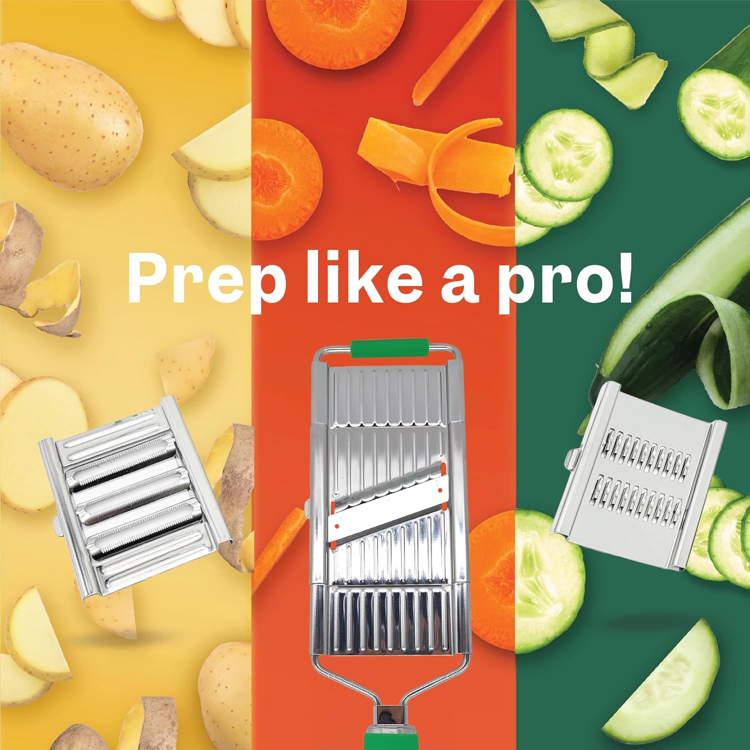 - Triple-Blade Mastery: Discover the unmatched versatility of the Ultimate Irish food mandoline slicer with its three interchangeable blades. The double-sided blade of the stainless steel slicer ensures a precise cut for visually appealing dishes. It also features a julienne blade, and a single blade so you can vary your choice of food cuts.