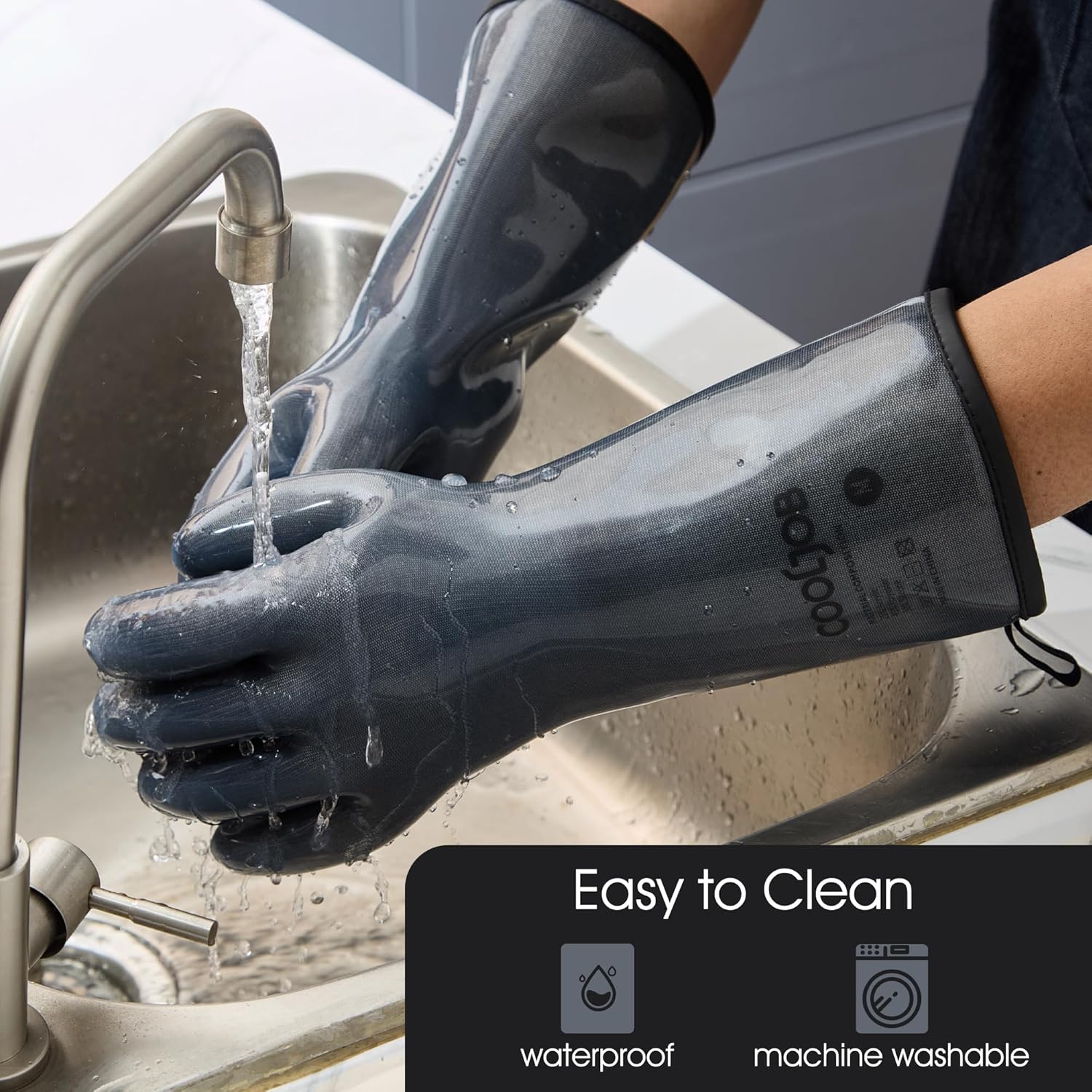 COOLJOB Heat Resistant Oven Gloves, Waterproof Liquid Silicone BBQ Grilling Gloves for Barbecue, Kitchen Cleaning, Baking, Food Contact, Black, Large