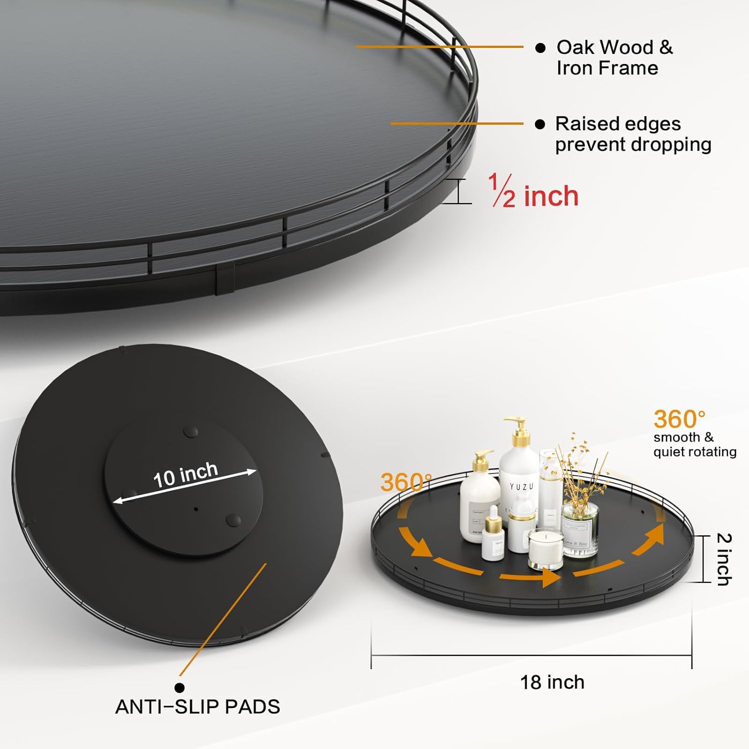 - ๐ง๐ต๐ผ๐๐ด๐ต๐๐ณ๐๐น ๐๐ฒ๐๐ถ๐ด๐ป: The turntable tray features a smooth and silent 360ยฐrotation; Bottom slip-resistant pads for stability and protect your countertop from scratches; Raised edges on each organizer tray to keep items from falling out; Easy to use, no installation required