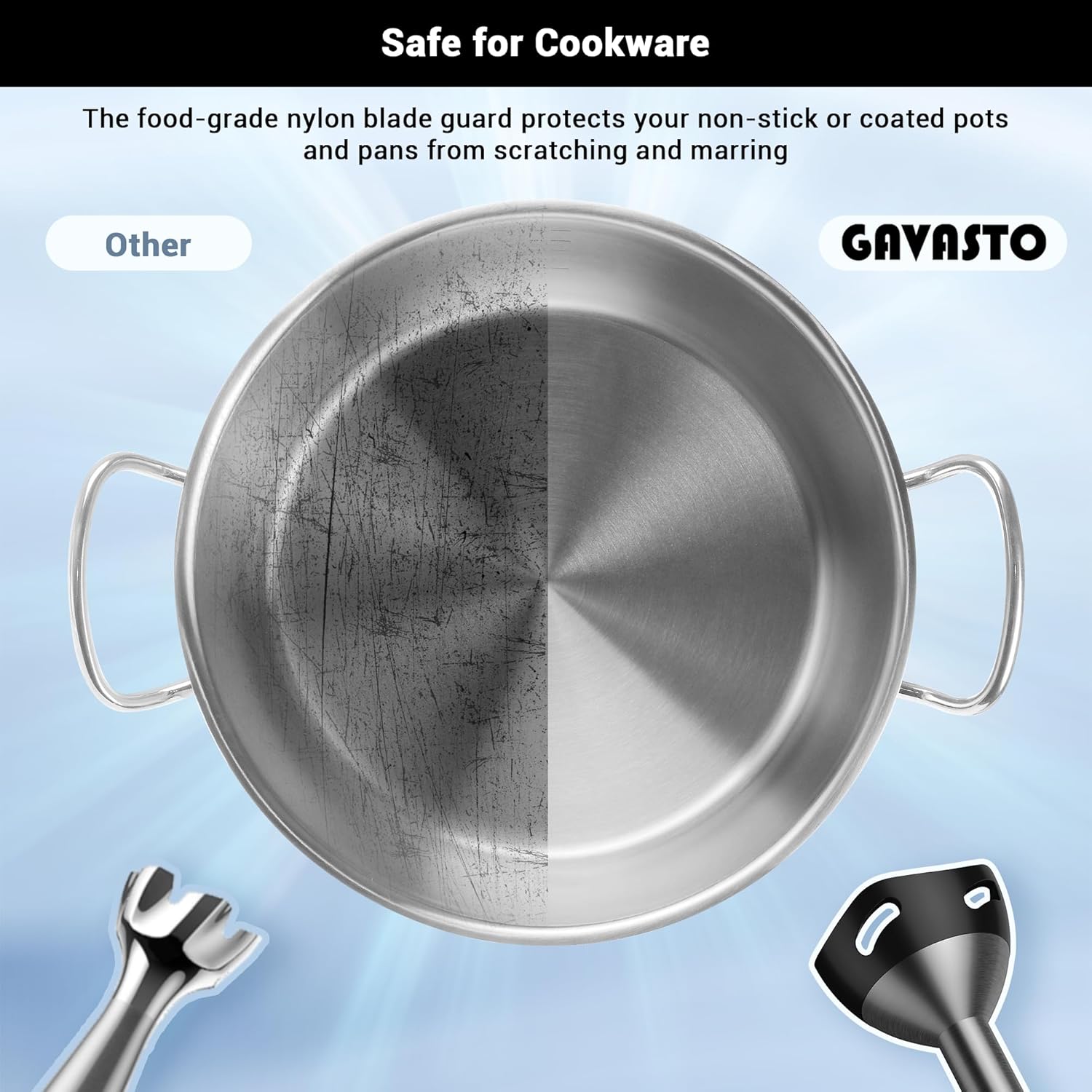 - Say Goodbye to Scratched Containers: Our hand blender stands out from bargain brands with its upgraded blade guard, ensuring your pots, pans, and other containers remain scratch-free. Featuring a unique bell-shaped guard, it not only prevents scratches but also minimizes splashing, leaving your kitchen spotless after each use.