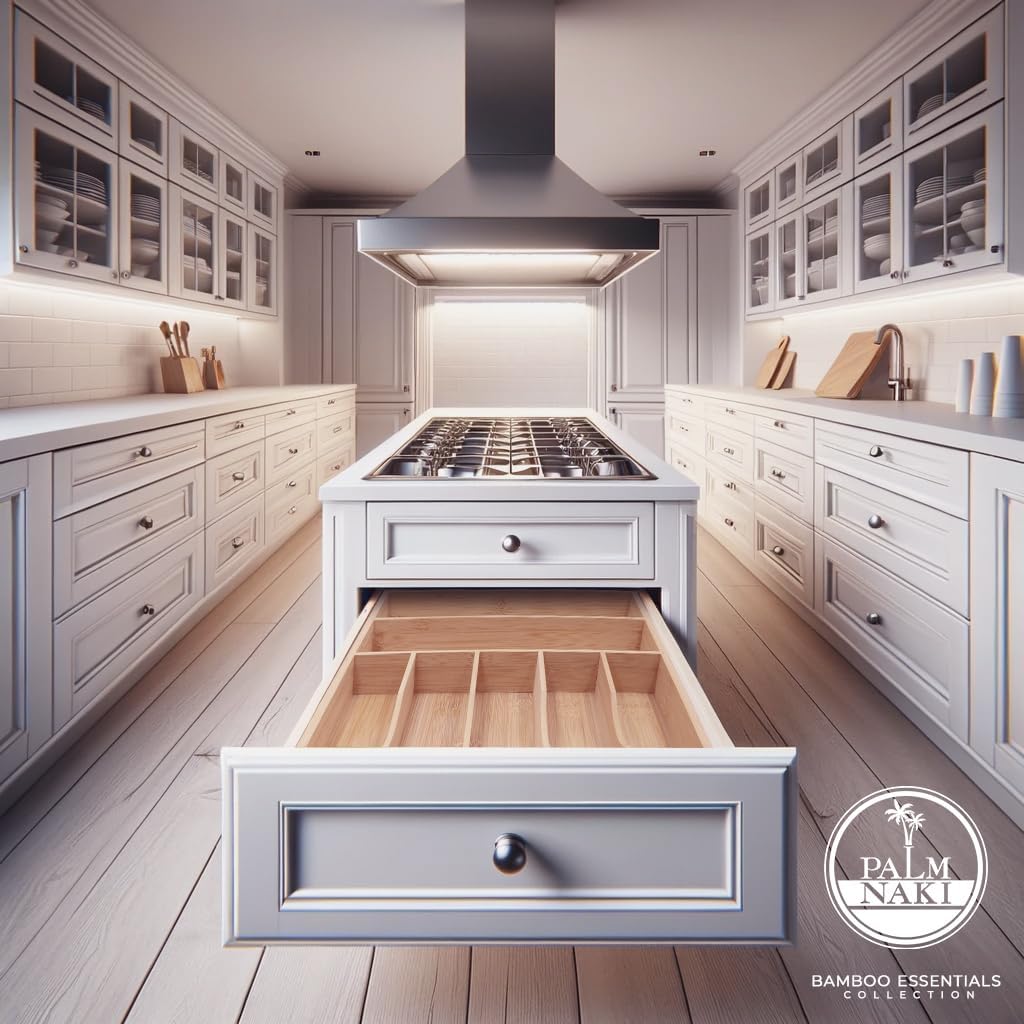 - πΏ Transform Your Space with Elegance and Efficiency - Discover the ultimate solution to declutter your drawers and beautify your home with Palm Naki's premium bamboo cutlery tray. Designed with precision, our organizer features expansive compartments tailored to fit drawers of any size, ensuring a custom fit that brings harmony and accessibility to your kitchen, office, or vanity.