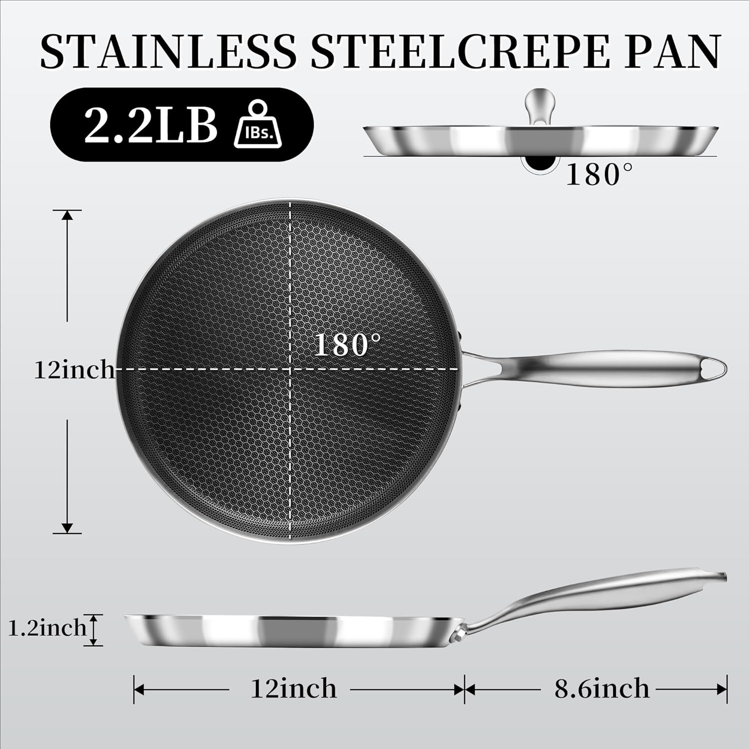 Nonstick Crepe Pan 12 inch Stainless Steel Crepe Pan Honeycomb Coating Flat Skillet Tawa Dosa Tortilla Pan,Omelet Pan with All Stove Tops Available, Induction Compatible