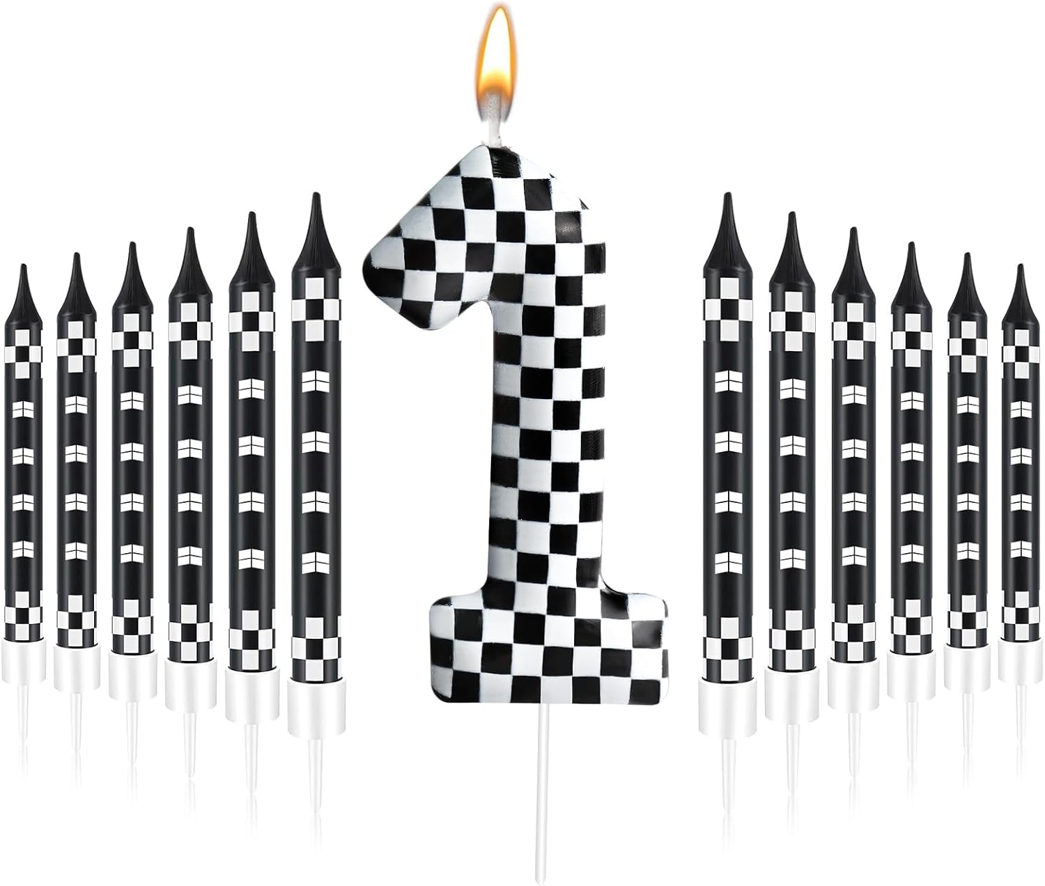 - The Package Includes: You will receive 12 black and white track car themed birthday candles and 1 number 1 black and white checkered candle, Sufficient quantity for birthday cake decoration or party celebration and daily use, note: the candle will slowly melt as it burns, and it is recommended not to leave it on the cake for more than two minutes
