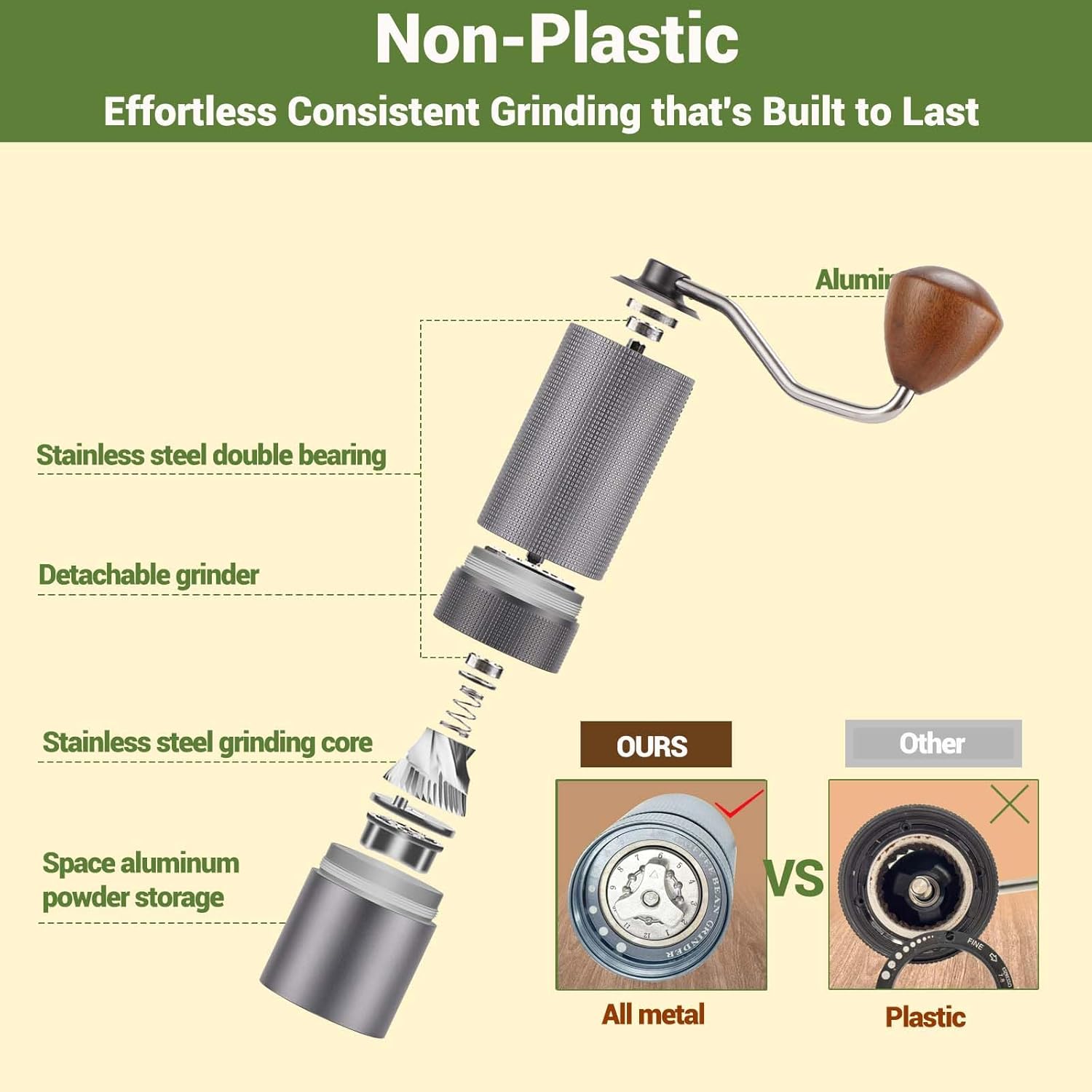 - Portable : The espresso coffee grinder runs virtually silent so you won't wake up your family or partner while preparing your morning beer, and the long handle is ergonomically designed without Laborious, easy to hold and carry, no sharp blades and electricity, all metal integrated, without any plastic parts