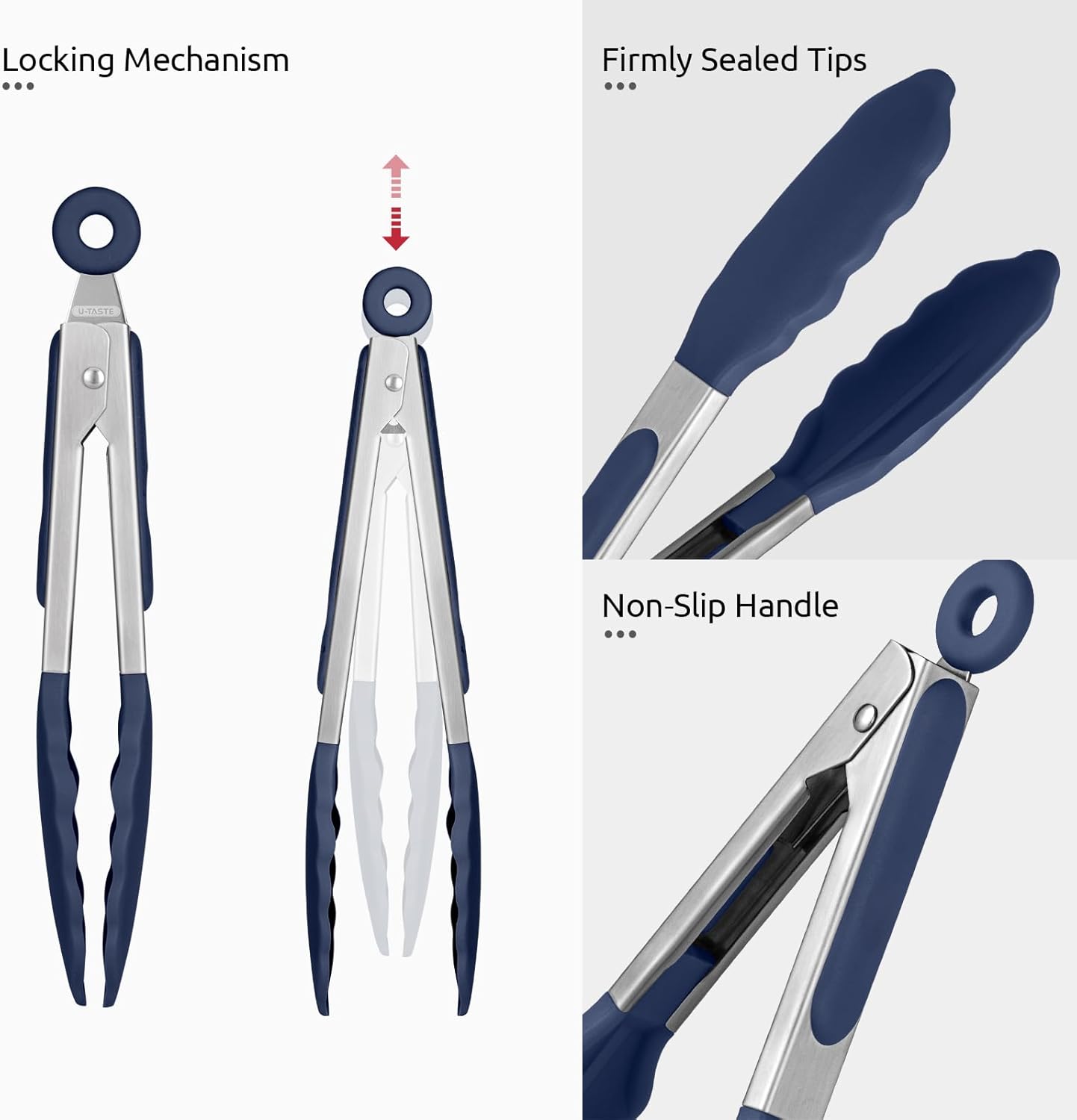 600ºF Heat Proof Kitchen Tong: U-Taste 7" Silicone Cooking Tong with Firm Sealed Non Stick Rubber Tips & Silicon Coated 18/8 Stainless Steel Handle & Smooth Locking for Serving Salad (Midnight Blue)