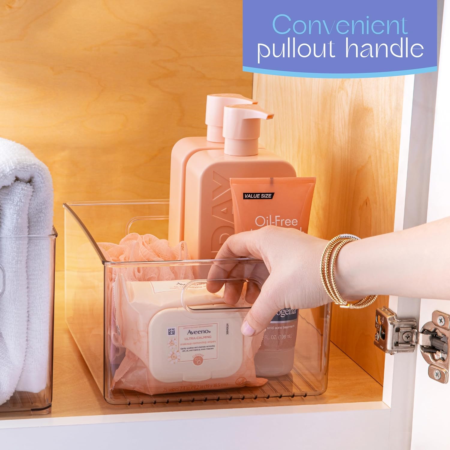 Plastic Food Storage 4 Pack Clear Container Bin with Handles for Organizing Kitchen, Pantry, Refrigerator, Freezer, Pantry, Cabinet, Closet, Bathroom 10”x8”x5”
