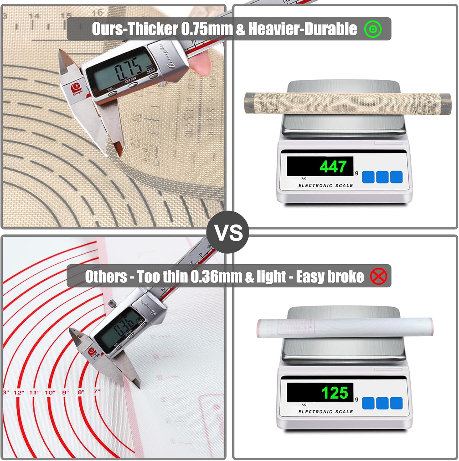 - 【Double Thickness & Extra Large】: Silicone baking mat is twice thickness(0.75mm) than the other dough mat (0.35mm) on the market. Our silicone pad will stay good on the table and not wrinkle when used. Ultra large size pastry mats(24X36 inch), which prevent the flour or fondant will be spilled on the table.