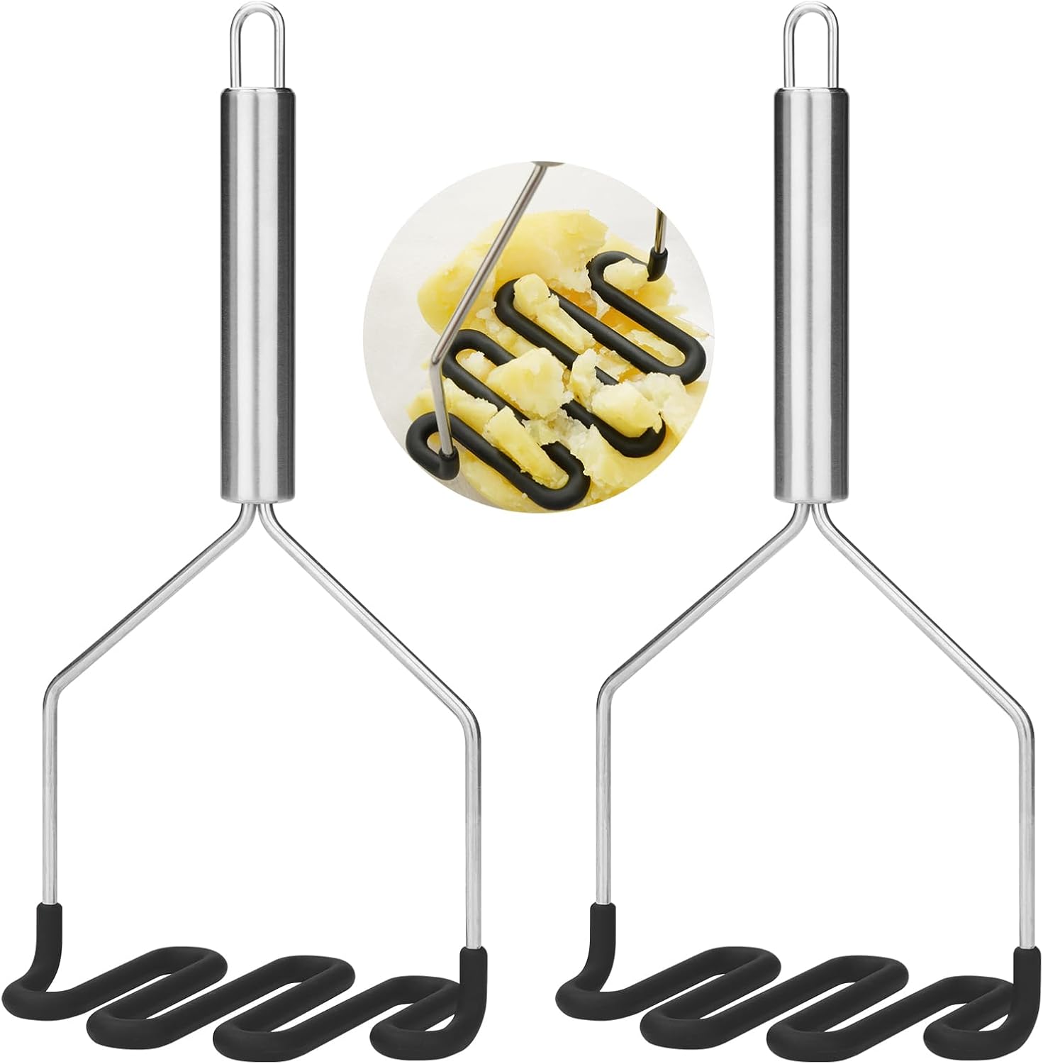 SHIKORI Non-Scratch Silicone Potato Masher Kitchen Tool, Potatoes Masher Potato Masher Stainless Steel Wrapped In Premium Silicone, Potato Smasher 2 Pcs-Black