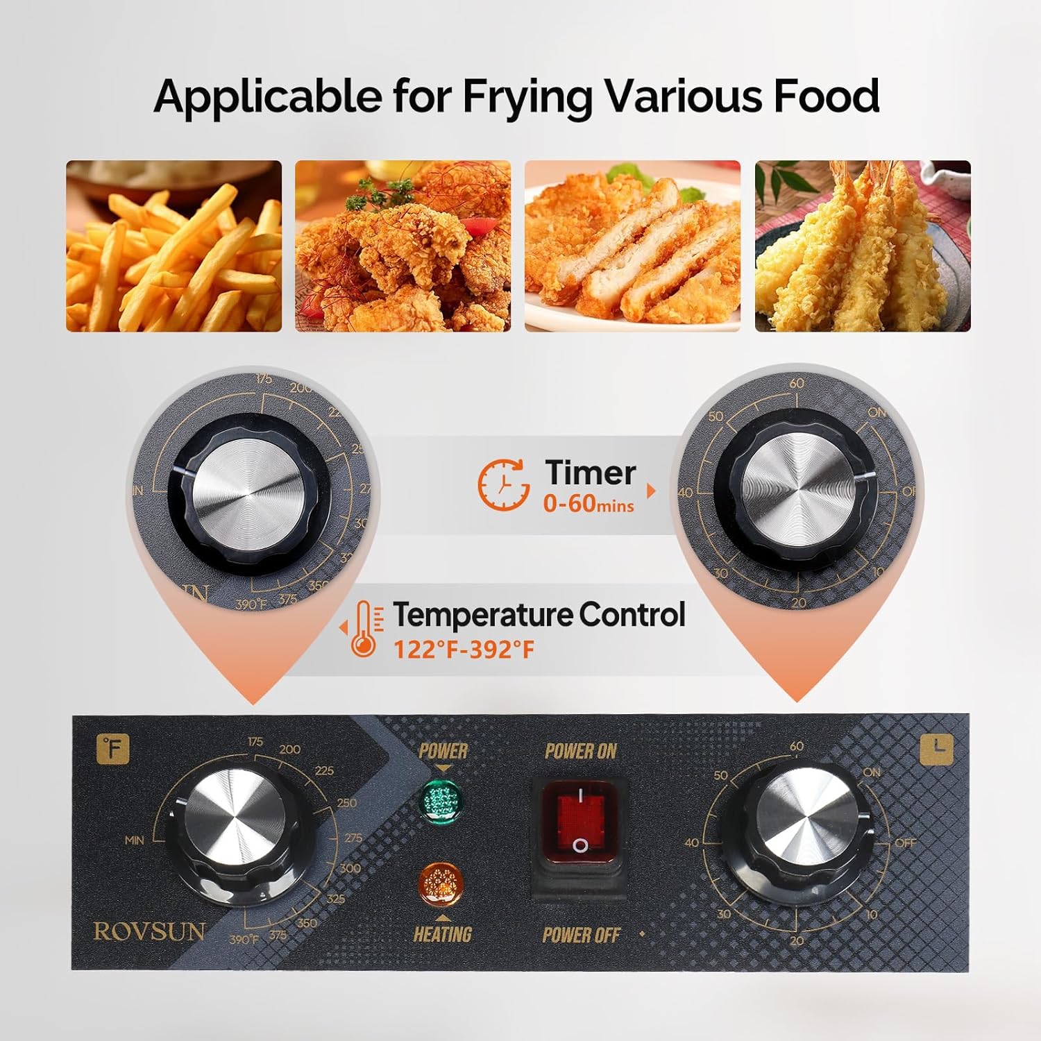 - 【Timer and Temp Control】One temperature knob and a 60-minute timer controls a tank, you can choose the right temperature based on what you'd like to fry. Besides, the oil deep fryer is designed with U-shaped 304 stainless steel heating tubes for evenly heat distribution. Temperature Range: 50℃ - 200℃ (122℉ - 392℉). NOTE: The deep fryer Needs AT LEAST 16A OUTLET To Support It