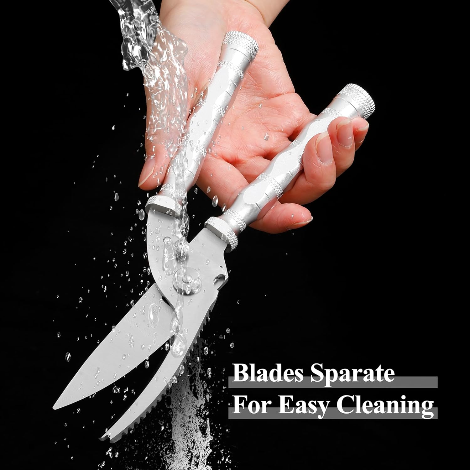 - 【Premium quality ultra-sharp Poultry shears】The high-quality kitchen poultry shears forged from premium stainless steel are sharper and thicker. Kitchen scissors are a professional heavy-duty kitchen scissors with a quick and easy detachable structure where one blade can be turned into a knife. The detachable blade also makes cleaning easier and does not leave a stain on the scissors.