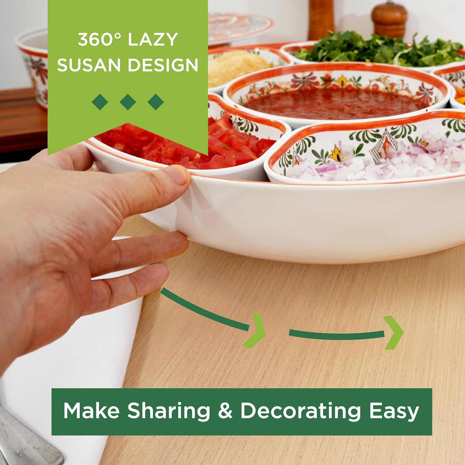 - Taco Night Applicable: Perfect for any occasion, this platter is a must-have for family gatherings, birthday parties, watching a ball game, and movie nights. Its swivel feature ensures easy access to snacks and dips, making your event more relaxed and enjoyable