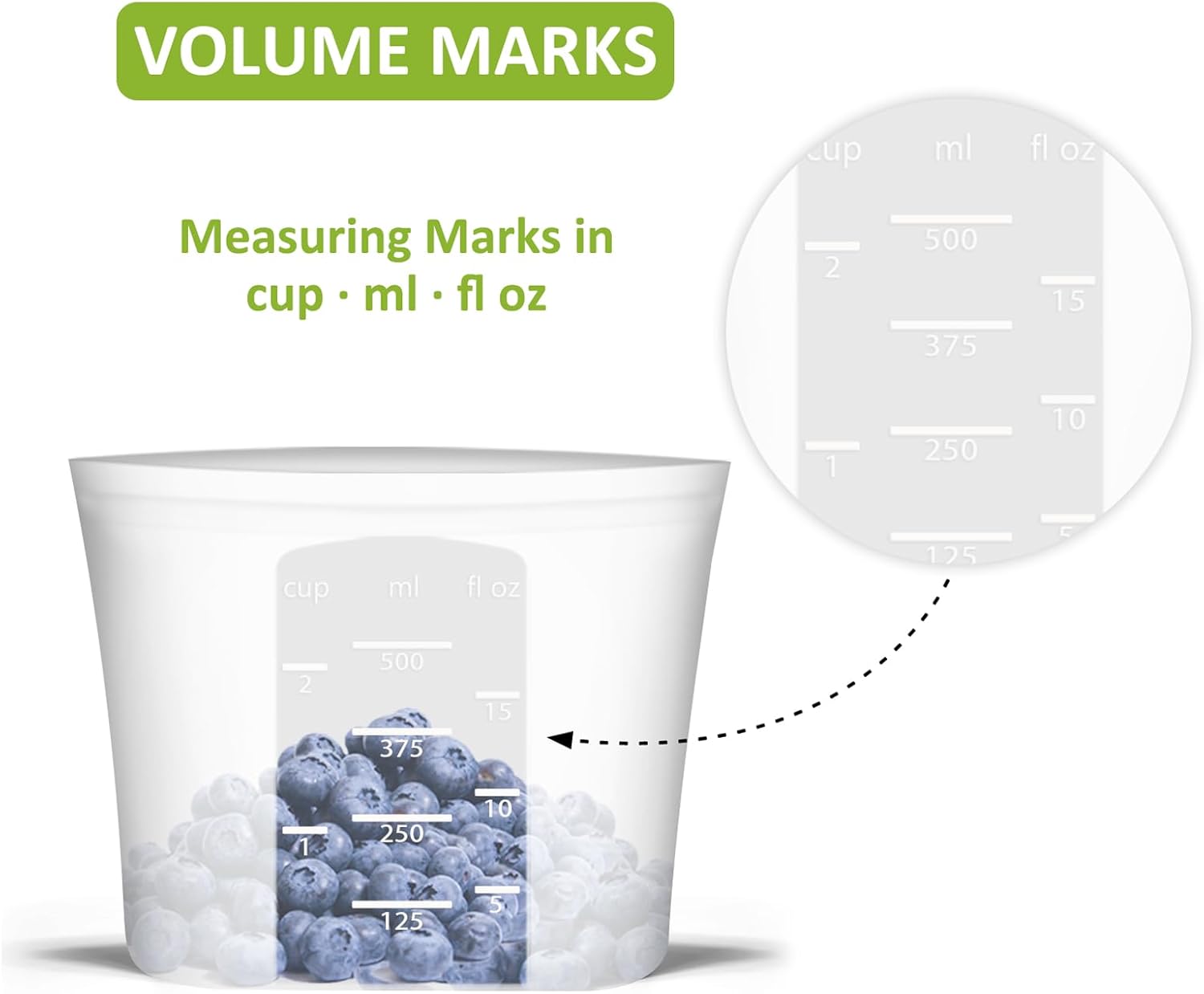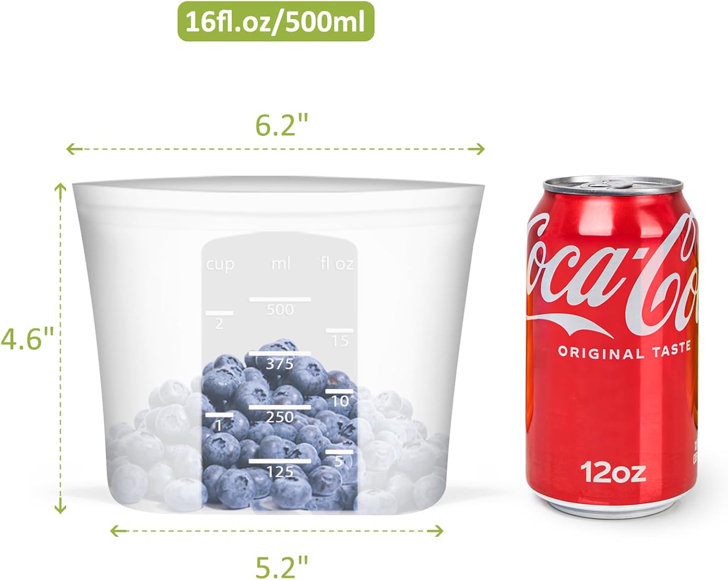 - 【THOUGHTFUL & ECONOMICAL】Snack Size: 16fl.oz/500ml. These reusable silicone food storage bags come with clearly volume marks in cups, milliliters and fluid ounces for easy use. The translucent body helps to get a glimpse of what's inside, though not in crystal clear detail. Plus, One silicone bag can reduce up to 300+ single-use plastic bags a year, helping to create a waste-free world and save you a bundle