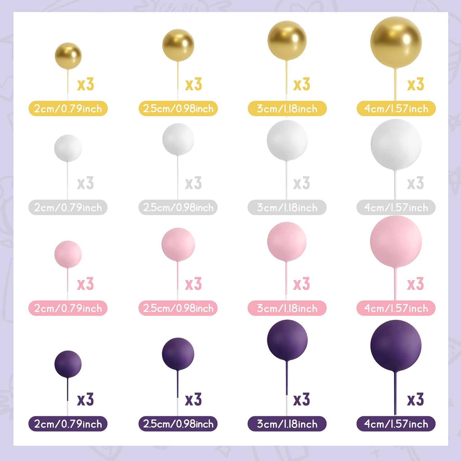 - Package Includes: You will get 48 pcs cake balls decorations in 4 colors and 10 butterflies cake decoration, including pink purple white and gold. 12 pieces of each color. The quantity of each sizes and colors included in each set are as shown in the picture