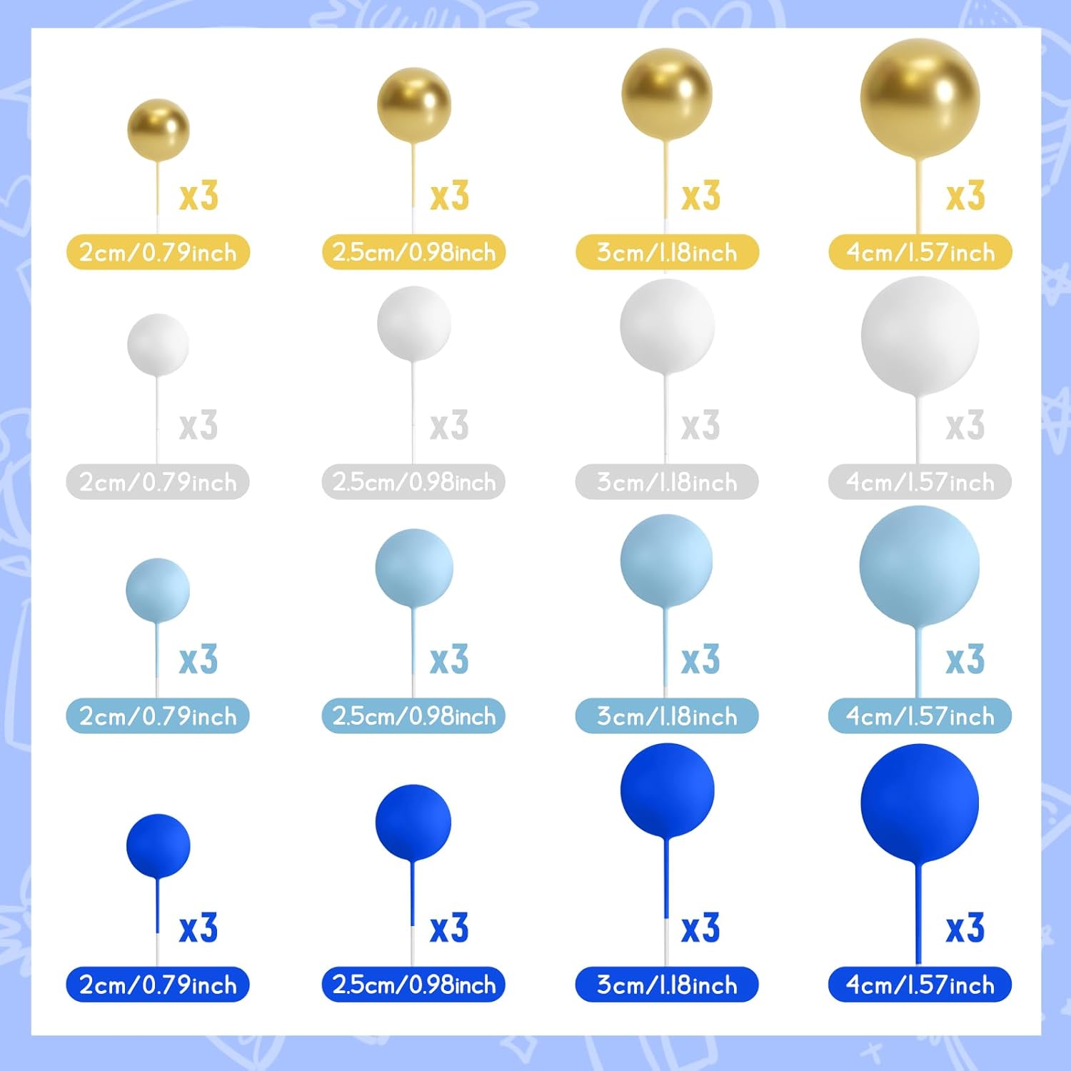 48 Pcs Balls Cake Topper Decorations Balloon Cupcake Toppers Foam Cake Topper Balls Cake Balls Decorations for Birthday Party Wedding Cake Decorating (Royal Blue, Light Blue, White, Gold)