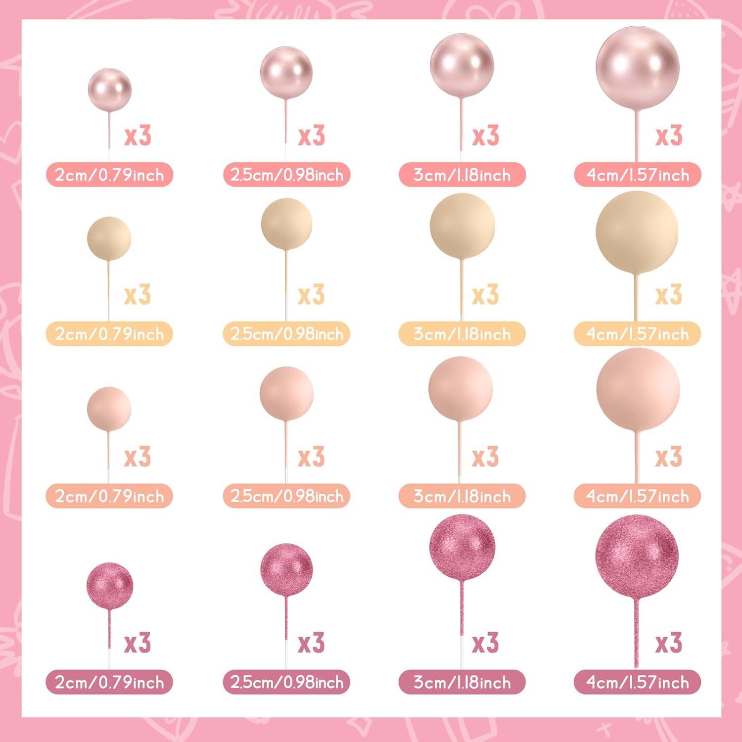 48 Pcs Balls Cake Topper Decorations Balloon Cupcake Toppers Foam Cake Topper Balls for Birthday Party Wedding Cake Deco(Glitter Pink, Rose Gold, Light Brown, Apricot)