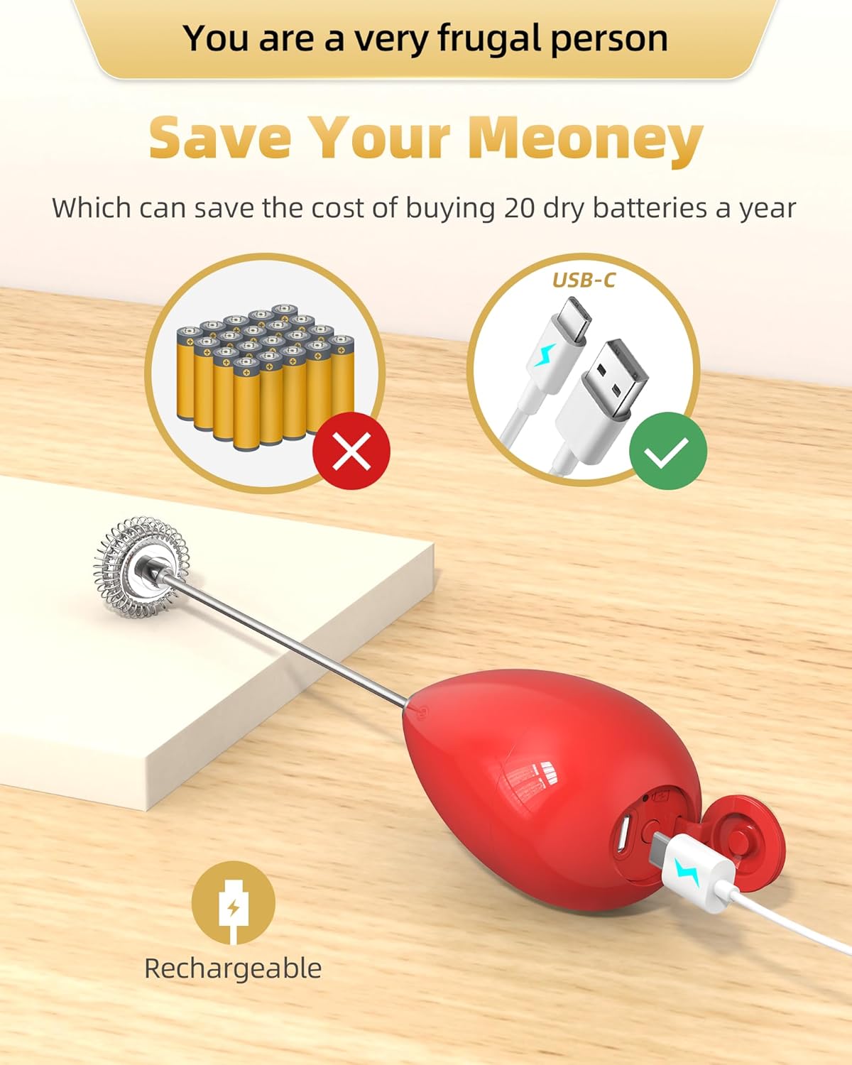 - 【You are a very frugal person】 so we use safe rechargeable batteries, which can save the cost of buying 20 dry batteries a year, and a full charge can make milk foam more than 100 times,save your meoney