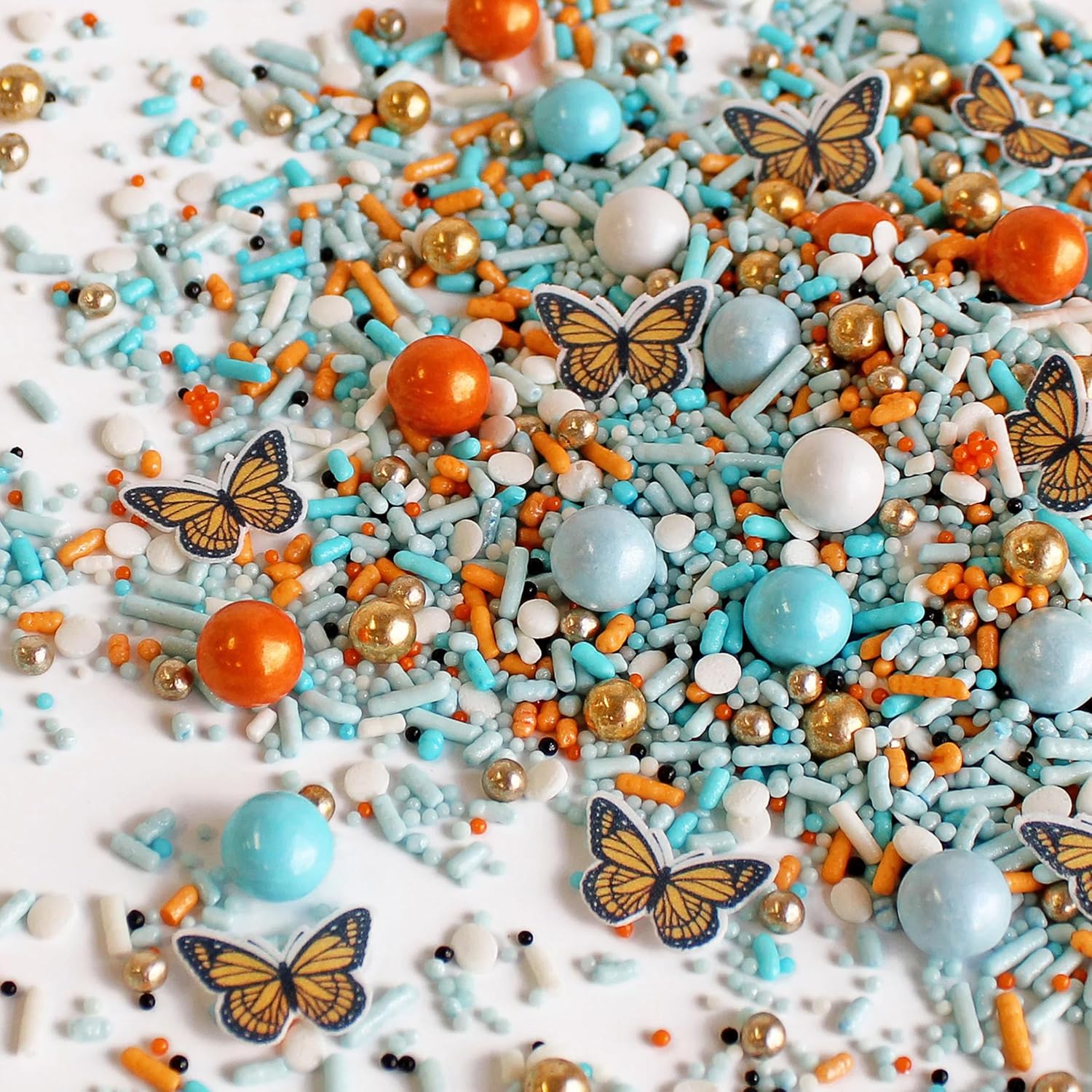 - Vibrant sprinkle mix featuring blue and orange hues, adorned with delicate butterfly wafer paper and golden dragees, perfect for adding a whimsical touch to Mother's Day donuts, cupcakes, cakes, and cookies