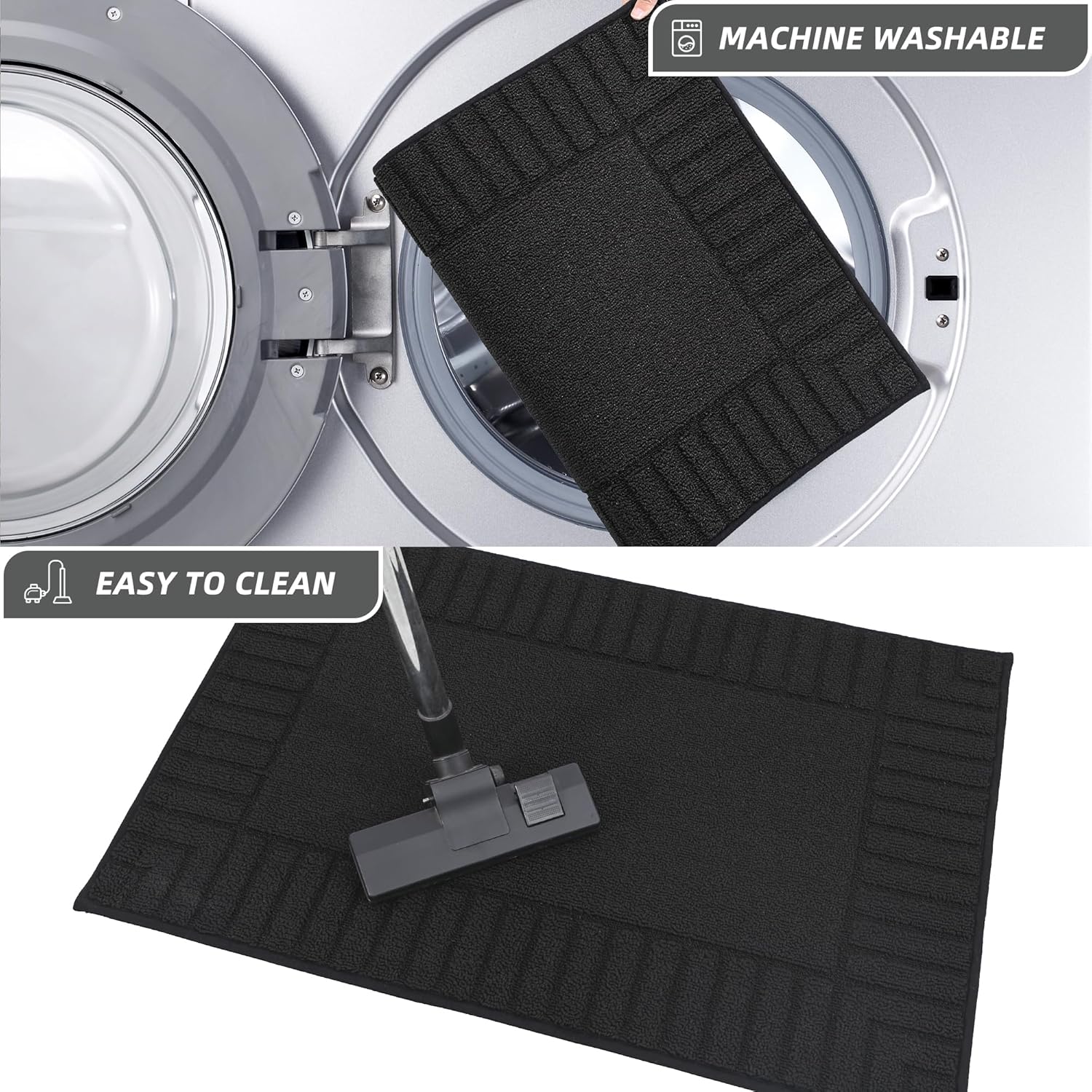 - Our non skid washable kitchen rugs are easily cleaned.You just clean the kitchen mat set by the vacuum.They are machine washable.Don't worry about fiber falling because of edge locking technology.Our mat for kitchen floor can be reusable for long time. kitchen mats still maintain shape and colors.