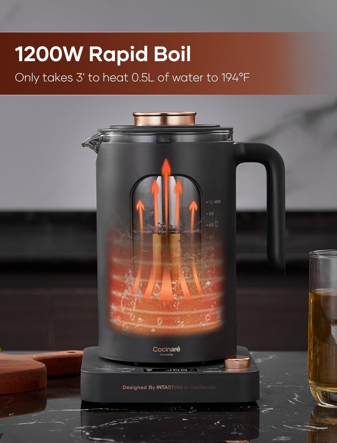 Electric Tea Kettle, INTASTING Glass Electric Kettle with tea Infuser and Precise knob temperature control, 1200W Fast Heating, BPA-Free, Easy to Clean, for Tea and coffee, 1 Liter (Dark Gray)