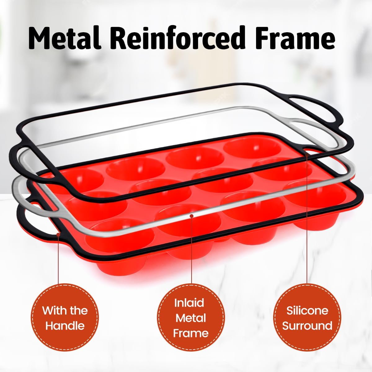 FUNBAKY Silicone Muffin Pan for Baking, Metal Reinforced Frame Muffin Pan Nonstick 12 Cups for Oven Baking Easy to Handle BPA Free
