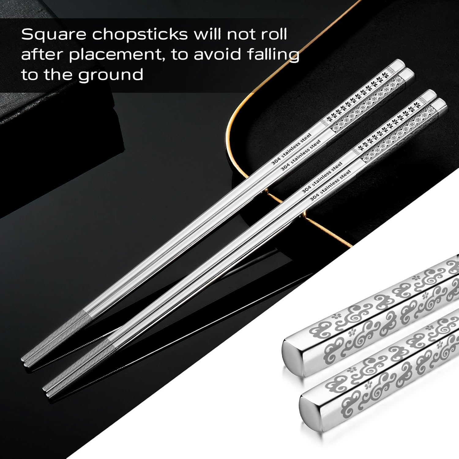 - 8 Different Laser Etching Patterns, Elegant And Beautiful: The end of the chopsticks metal has a laser etching pattern, and the advanced laser etching process ensures that the pattern will not fade and wear. Different patterns also could help to distinguish users. The square design of stainless chopsticks will make sure they will not roll after placement, to avoid falling to the ground.