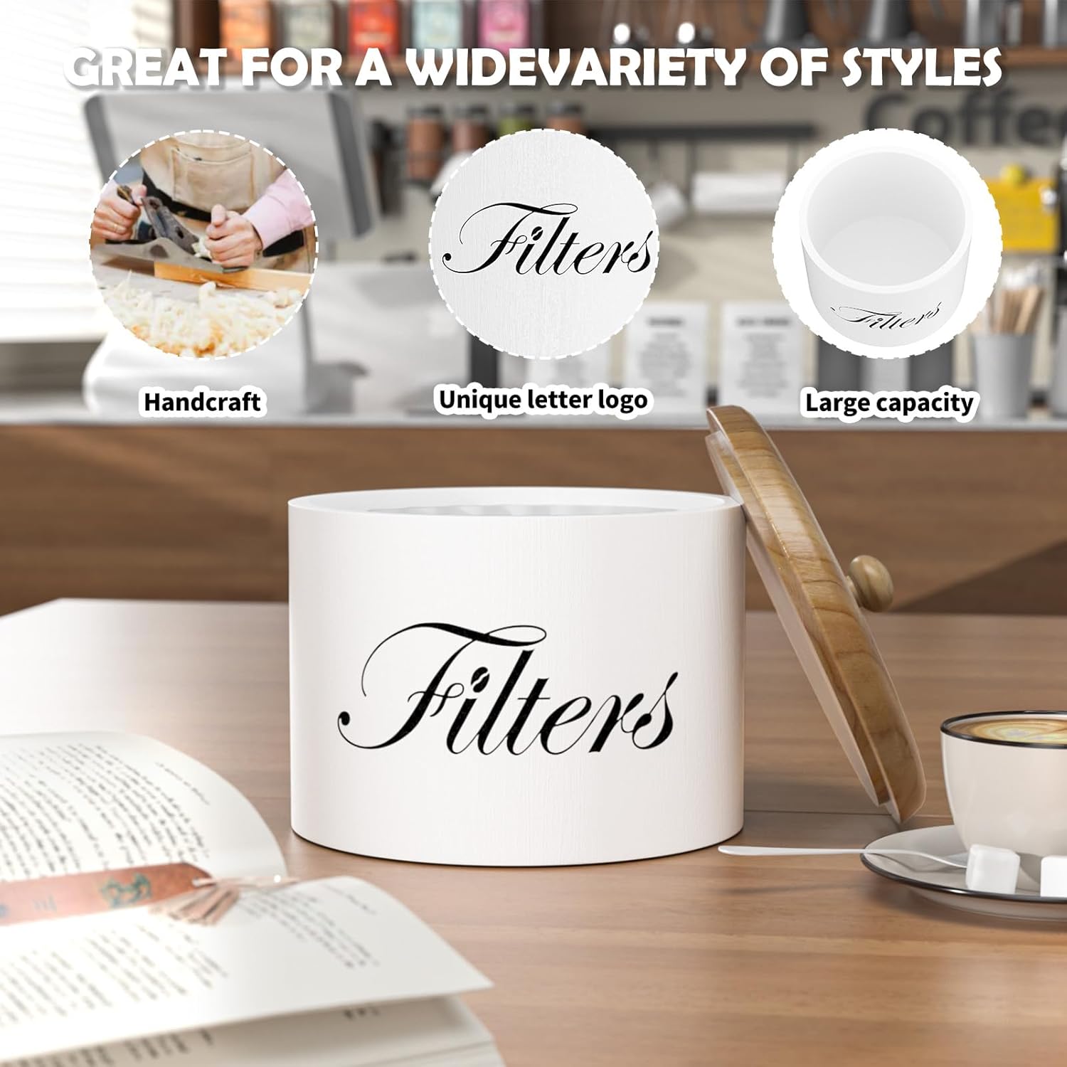 - 【Keeps Filter From Losing Shape】: This round coffee filter holder measures 6.3" in diameter x 6" high, large can keep your coffee filters from losing shape and adds class to your home or coffee bar. Add style and functionality with this rustic farmhouse coffee bar organizer.