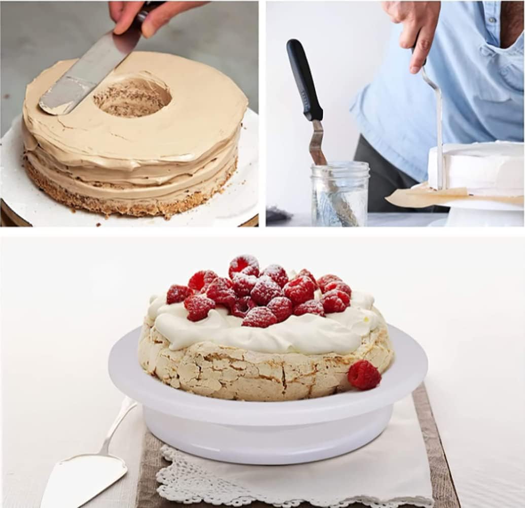 - 【ALL THE FEATURES】Our spinning cake decorating stand is composed of food grade ABS plastic material, Ball earing of turn mechanism awith satisfied weight capacity.
