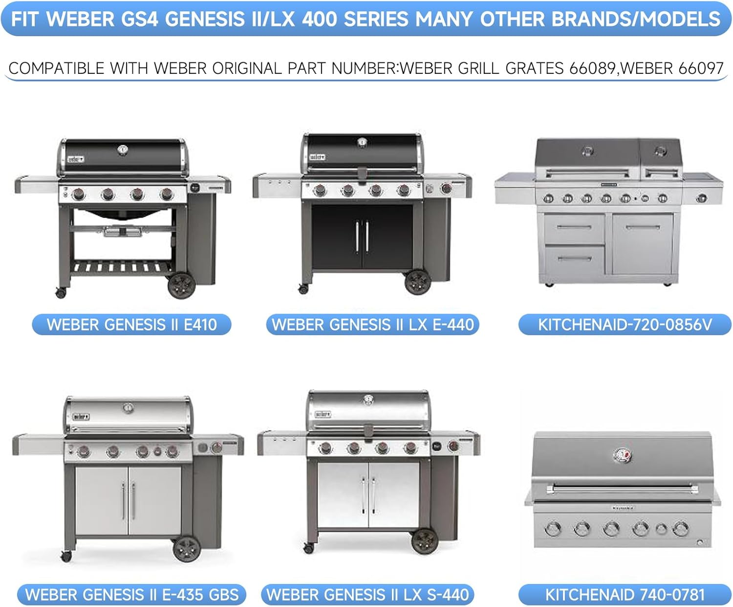 - Fit Genesis II LX 400 Series Grill: For weber genesis ii lx 400 grates replacement: weber genesis ii LX E-410, weber genesis ii LX E-440, weber genesis ii LX 440, weber genesis ii LX S-440. Compatible with Weber original part number: Weber grill grates 66089, weber 66097, weber 7854