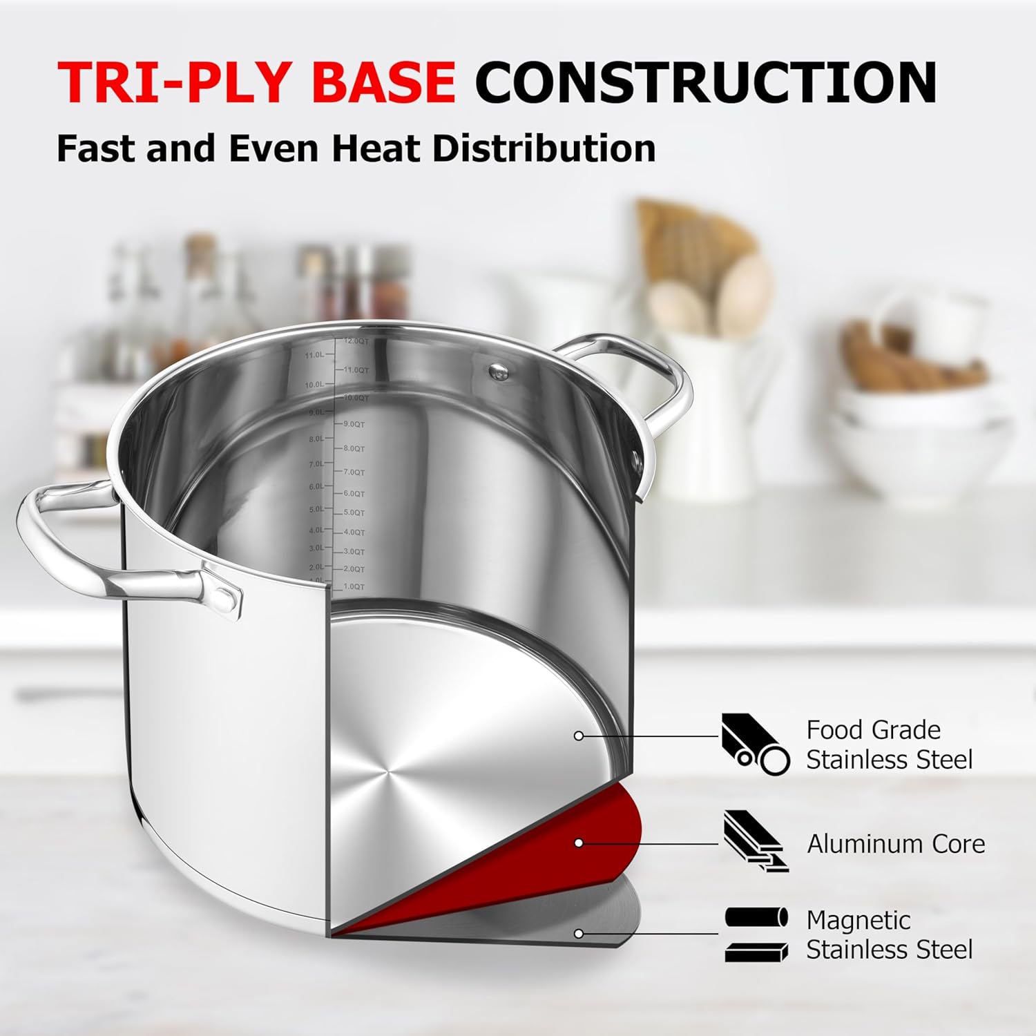 - Tri-ply Based Construction, the bottom of cooking pot consists of 3 layers. The inner layer is food grade stainless steel, itβs safe to contain food; the outer layer is magnetic stainless steel that decides this stockpot can be compatible with induction cooker, gas, electric, halogen, ceramic and oven. Between them, the impact-bonding aluminum core facilitates the soup pot a fast and even heat distribution and good heat conduction