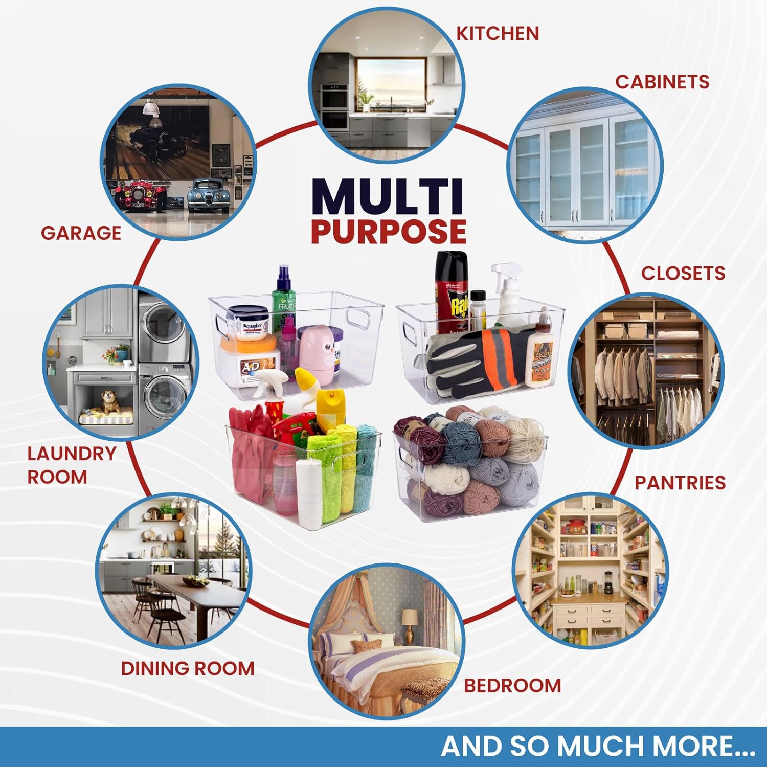 - YOU WON'T FIND A MORE VERSATILE SET OF BINS: You can use these large clear plastic storage containers with lids for organizing any space in and around your home โ the kitchen, cabinets, refrigerator, closets, pantries, bedroom, dining room, laundry room, nursery, garage, kids toy room, under sink organizers and more.