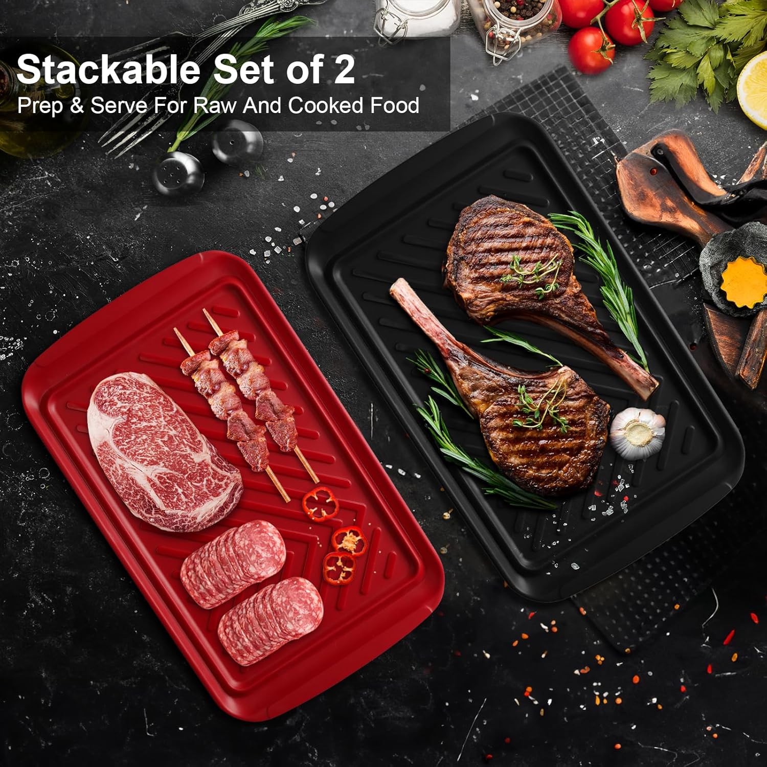 - A MUST-NEEDED GRILLING TRAY: Use the red one to prepare raw meat and transport it to the gill, after cooked, the black one use to serve the grilled food.