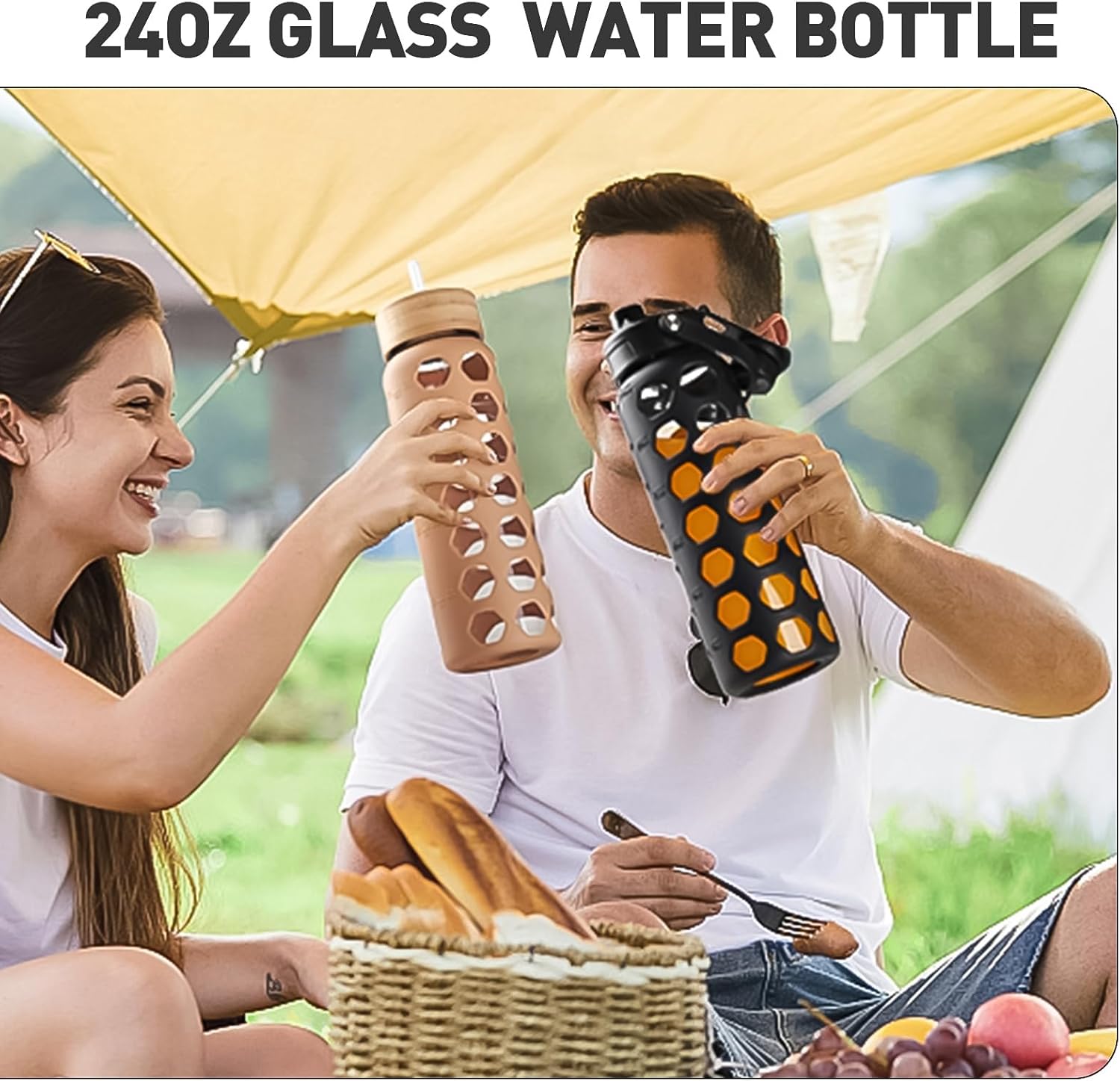 - GLASS WATER BOTTLES WITH TIME MARKER:MUKOKO 24oz glass water bottle with time marker preserves the purity of water.This is a very handy way to keep up with daily water intake,stay hydrated and healthy.