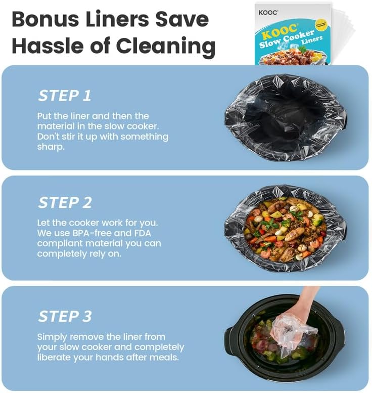 - [Additional Liners] Each KOOC slow cooker comes with 6 additional slow cooker liners that fit snugly inside the crocks for easy cleanup and maintenance