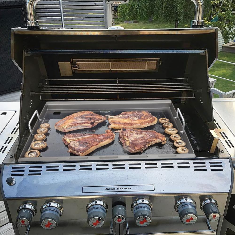 - 【Features】The inserts griddle is closer to the fire source and heats up more easily than other griddles placed on the grates to achieve the temperature needed to cook delicious food. Before use, please remove the heat plates to achieve closer to the heat source. The surface of the baking pan is made of coating, durable and easy to clean, need to be heated and oiled 1-2 times before use for better results.