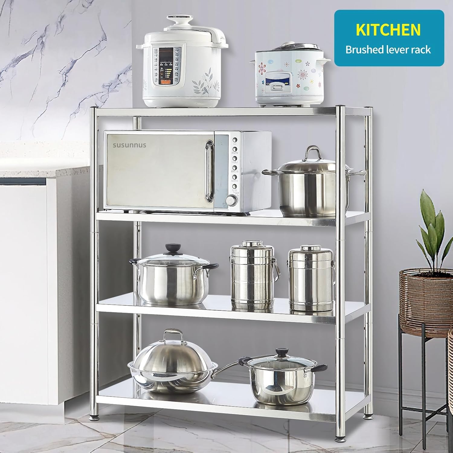 susunnus 4-Tier Stainless Steel Shelf, Heavy Duty Shelving for Kitchen, Garage, Industrial Storage, Kitchen Shelves Adjustable Feet, Easy to Clean(35.8in*15,8in Without Guardrails)