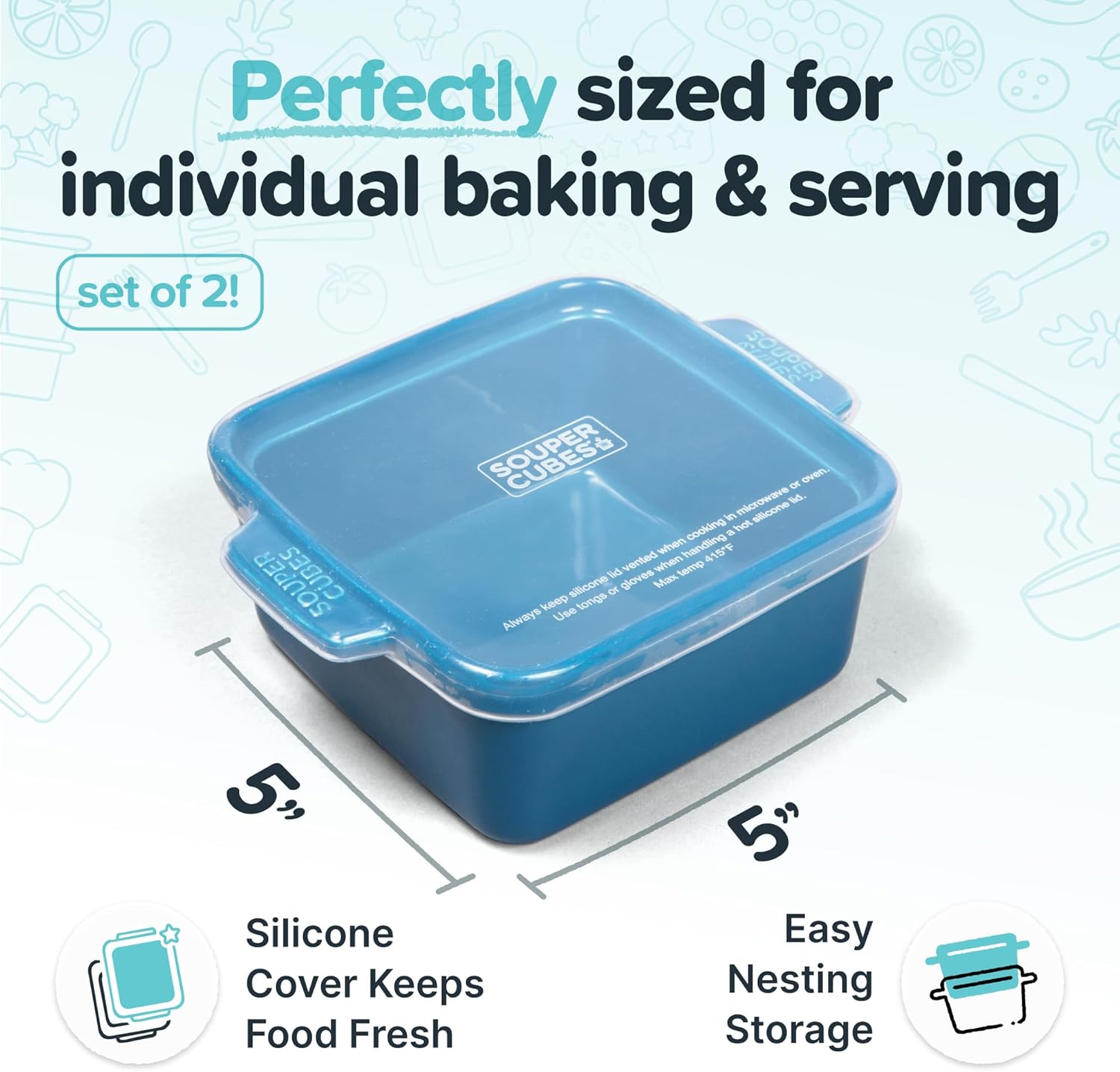 - GREAT FOR REHEATING: Souper Cubes blueberry 5” X 5” Stoneware is designed to make mealtime easy. Simply pop out your frozen portions from your Souper Cubes freezer tray and transfer them into our small ceramic baking dishes. Perfectly sized to fit cubes from our 2-cup and 1-cup trays, these 5x5 ceramic baking dishes are ideal for reheating in the oven or microwave. Please note: our stoneware is not intended for freezing—use it to reheat and enjoy!