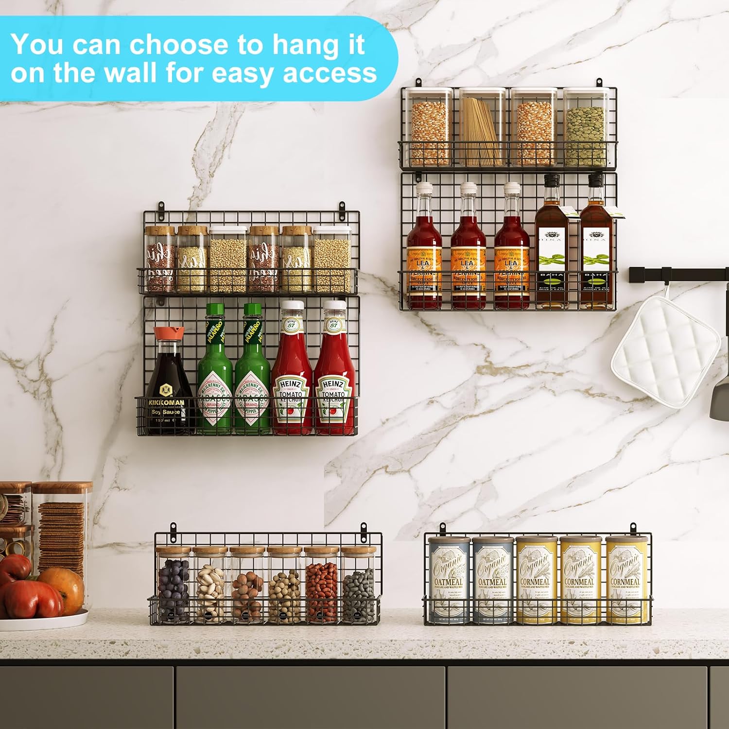 - 【Sturdy and Durable】: Crafted from robust iron wire with a black powder coating, our spice racks are built to last. They are resistant to rust and provide reliable support for your items. Each package includes installation hardware and instructions. It contains 6 racks in total: 3 small (16.33"L x 2.7"W x 6.1"H) , 1 large (16.8"L x 4.7"W x 6.5"H) and 2 extra tall large (16.8"L x 4.7"W x 10.7"H).