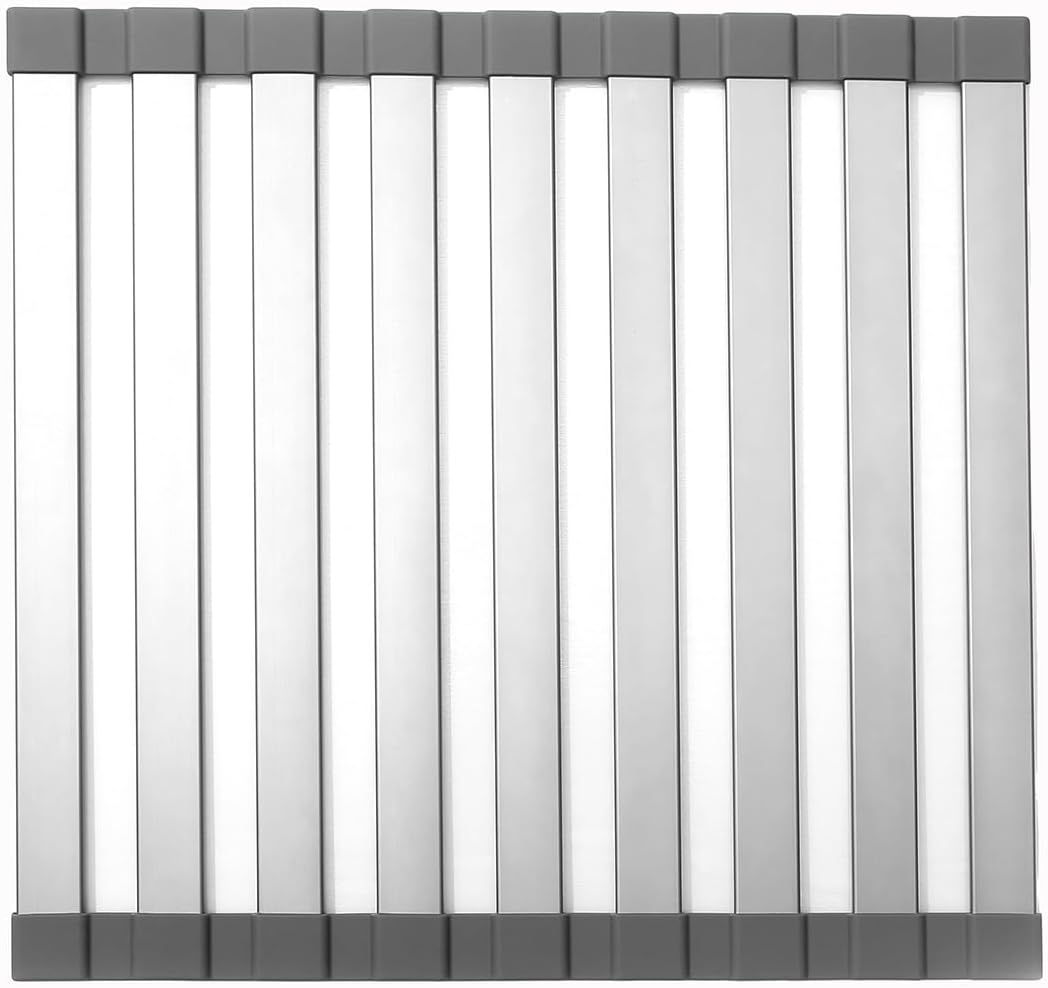 - SPACE SAVING : The foldable kitchen drying rack is designed with 9 stainless steel pieces, fixed firmly by silicone, which makes it easy to use, lay flat, clean or put away for storing in cabinet when not in use, saving your counter space. This dish drying rack over the sink adjustable design frees up much counter space then traditional dish drainer. Perfect for house organization and storage. Great gifts for your parents, families, friends and perfect house warming gifts for new home