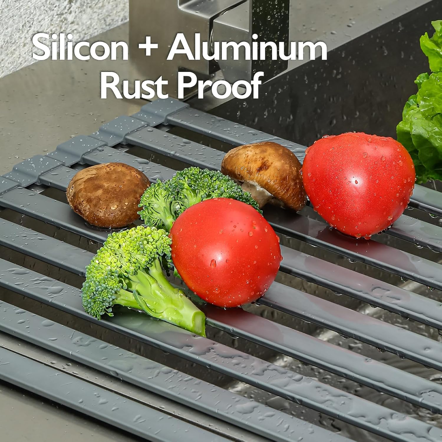 - HIGH QUALITY : Made of Silicone and Aluminum with sturdy construction, the collapsible cutting board over sink is sturdy, rust proof; not easy to bend or twist by heavy cookware. A great portable stainless steel rolling rack for apartment essentials and home accessories