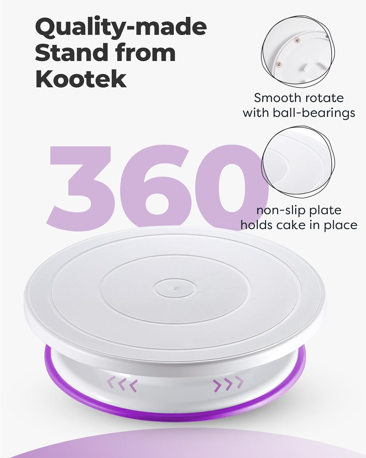 - 360Β° Spinning Cake Turntable: This essential baking supplies tool features a cake stand with an 11-inch diameter that spins smoothly on a hidden ball bearing, allowing you to achieve stunningly consistent patterns and gorgeous designs. With 360ΒΊ clockwise and counterclockwise rotation, you can decorate cakes like a pro.