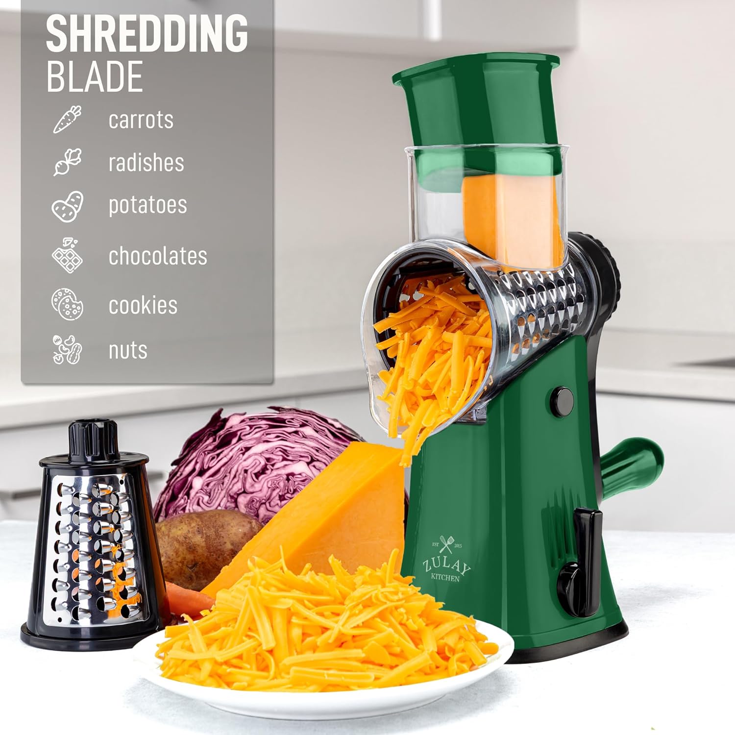 Zulay Kitchen Rotary Cheese Grater 5 Blade Cheese Shredder - Manual Hand Crank Cheese Grater With Reinforced Suction & 5 Interchangeable Drums - Easy to Use, Vegetable Chopper Round Mandoline Slicer