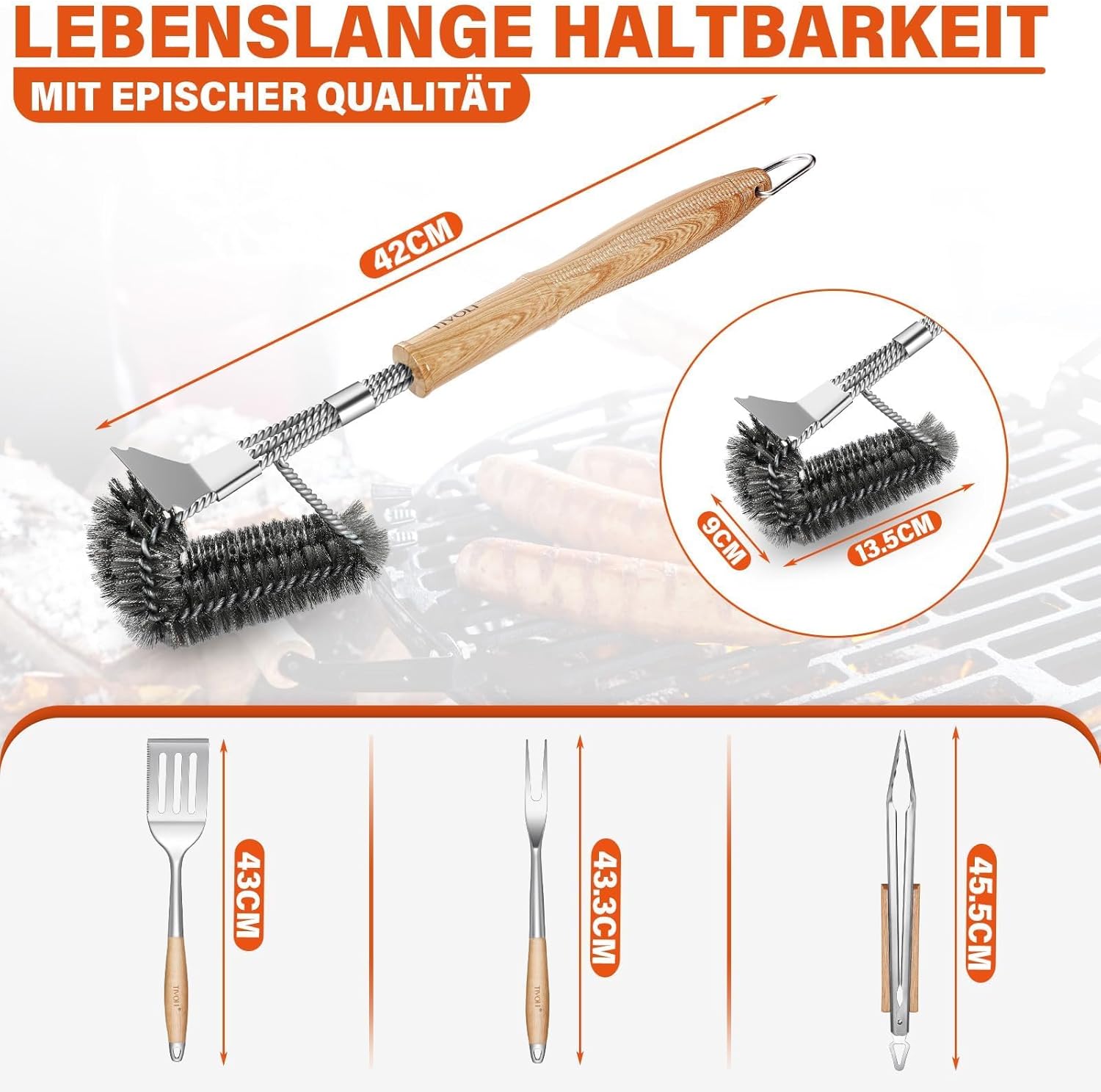 - COMPLETE GRILL SET: Our premium 4-piece BBQ set includes BBQ tongs, a spatula, a BBQ brush, and a BBQ fork. With these grilling accessories, you have all the tools you need for successful grilling. Effortlessly turn, lift, and serve food. Perfect for daily grilling with family or friends.