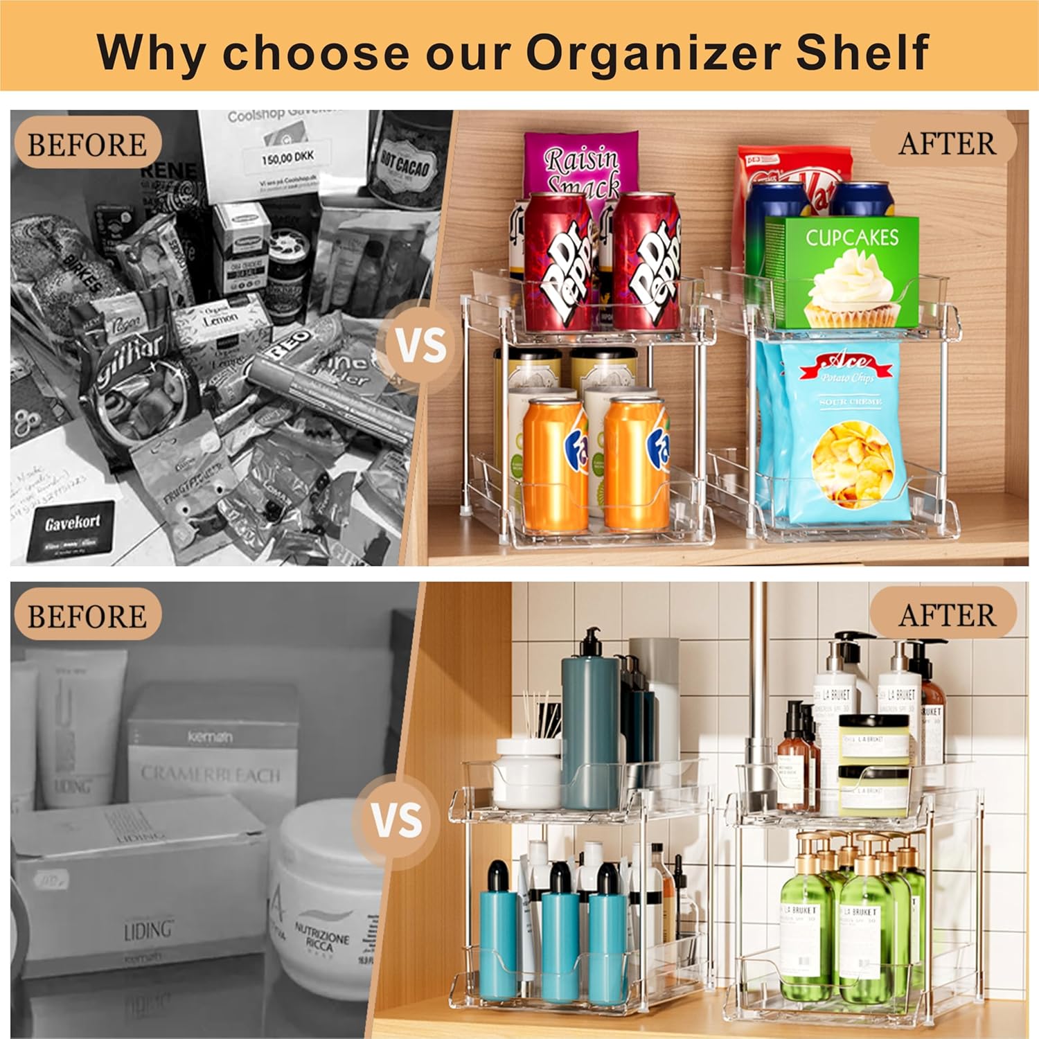 - Storage Space :Clear Under sink organizers and storage is spacious enough in two levels maximizes vertical space. The double tier sliding drawers can be pulled out by the handles for easy access to get items behind the front row. Effectively using the entire space of the cabinet.